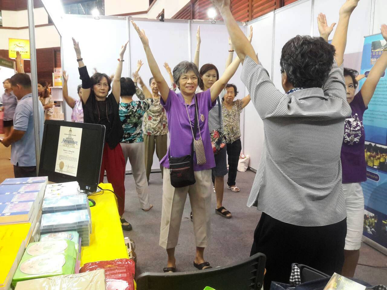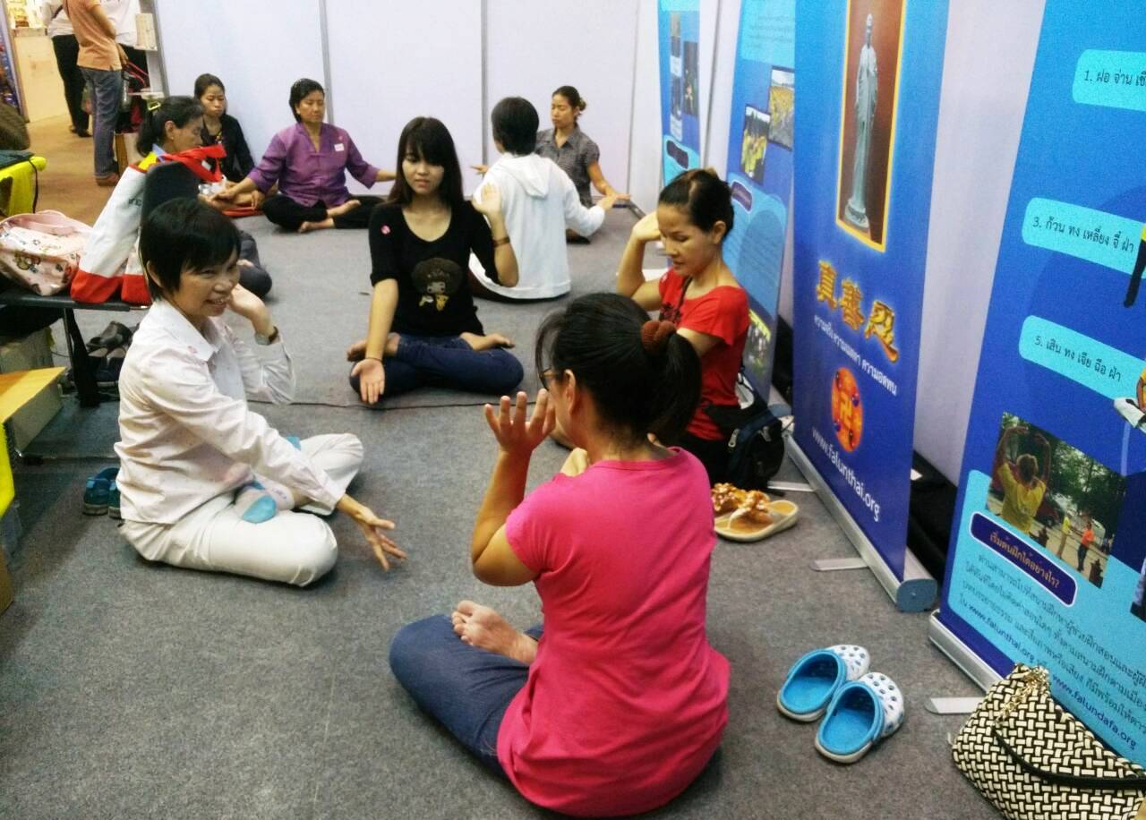 五天的会展期间,法轮功展位始终吸引着人们,一批批了解了真相的泰国民众当场跟随学炼,场面十分热烈。