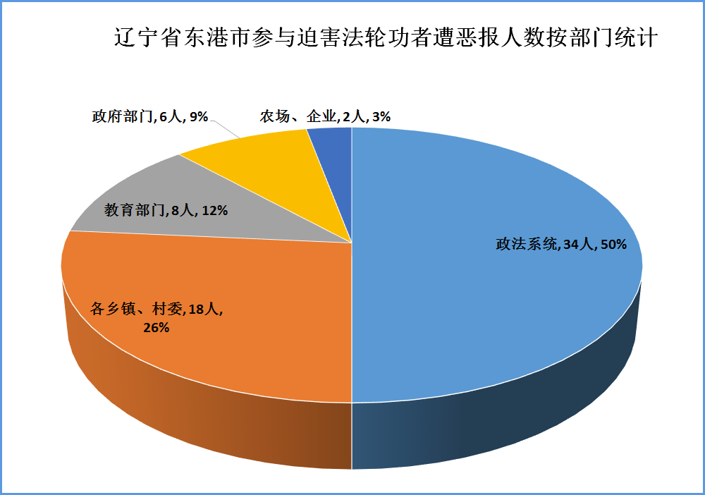 以下我们统计了六十六个恶报实例(实际远不止这些),其中公检法司部门(包括公安警察遭恶报的有二十八例,政法委人员遭恶报的有二例;法院人员遭恶报的有三例)共三十四例;政府部门遭恶报的有五例;乡镇政府、村委遭恶报的有十八例;教育部门(包括学校、教育局)遭恶报的有八例;农场、企业遭恶报的有二例。