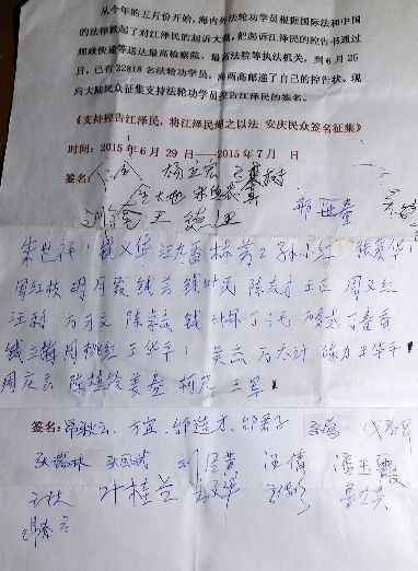为了让家乡众生有一个美好的未来,我们两位法轮功学员先行一步,开展了在安庆普通民众中征集支持法轮功学员控告江泽民的签名活动。经过一个星期的征集,有57位正义民众表态支持并签名。