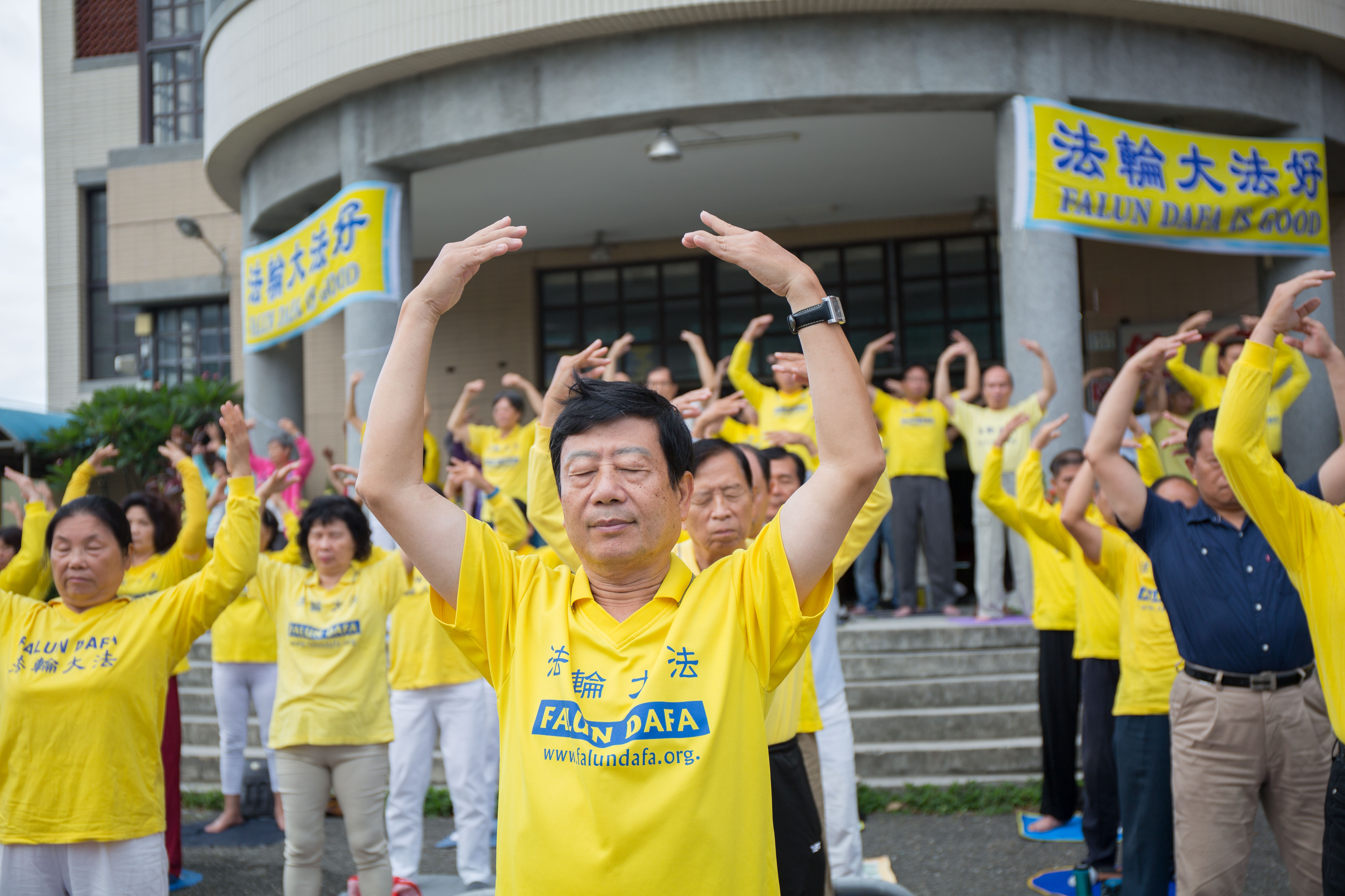 ![]() 图1-3:二零一五年八月十六日,来自南台湾二百多个炼功点的辅导员在嘉义市劳工育乐中心一起晨炼。 |