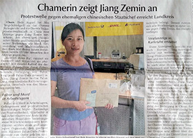 八月二十二日德国法轮功修炼者Min Teng-Schwägerl女士向两高递交了诉江状,控告江泽民故意杀人罪,诽谤罪和滥用职权罪。
