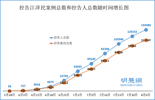 从5月底到8月6日,明慧网已收到总数134386名(111597案例)法轮功学员及家人递交给中国最高检察院、最高法院、公安部等相关部门的诉讼状副本。7月31日至8月6日一周内,超过14234人(12416案例)递交诉状控告江泽民。由于网络封锁和信息传输的不便,实际数字不止于此。