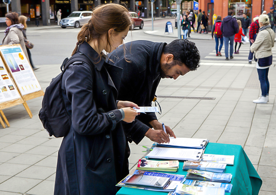 中年男士Erik Olsson居住在乌普萨拉市,路过活动场地时,他主动上前和学员交谈。他说:“每年我都在这里看到你们,这儿是那么祥和、美好,令人感到很舒服。遗憾的是(中共)迫害还没有停止,我要再度签名支持你们。”