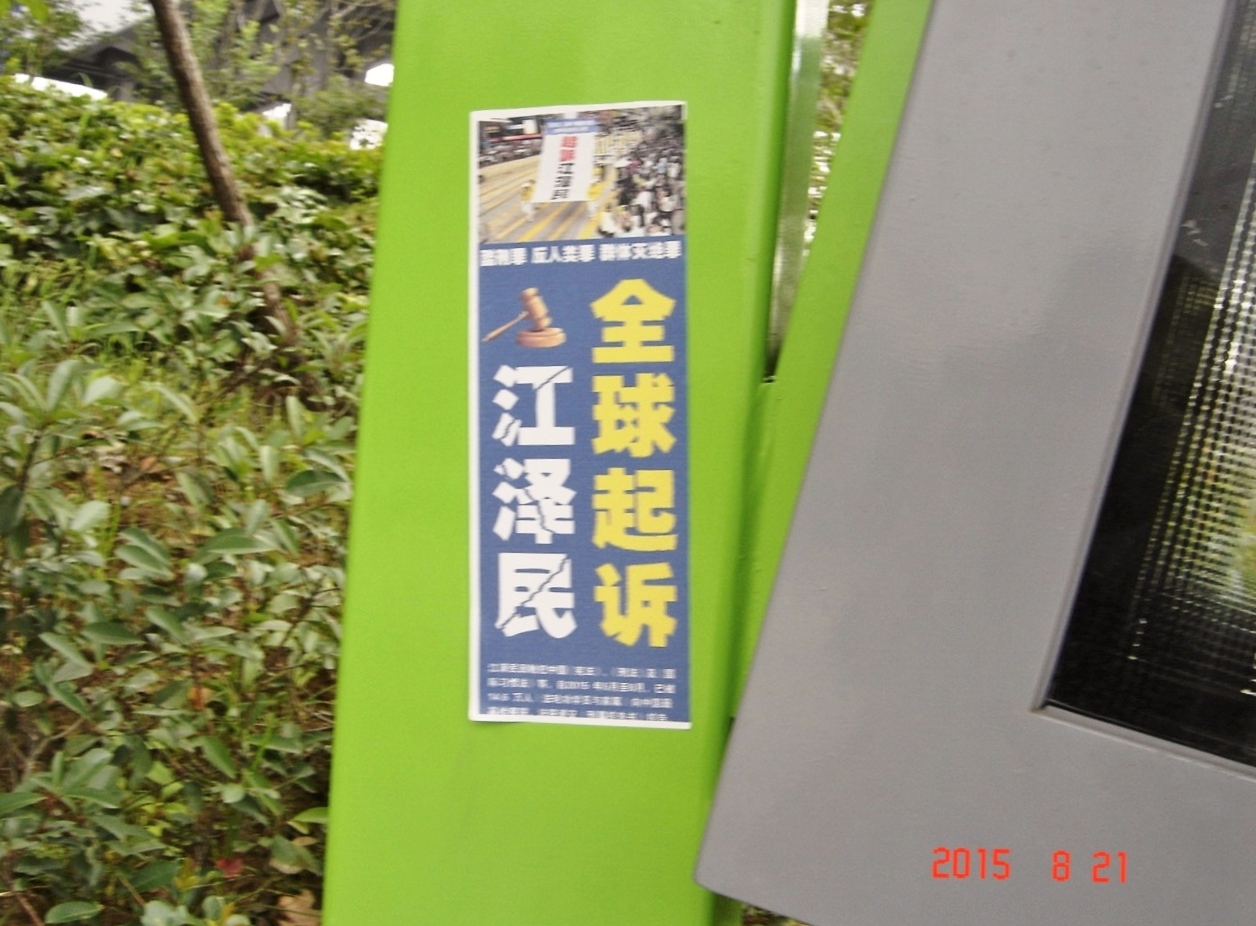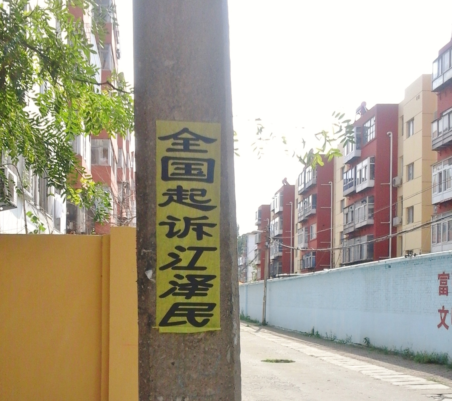 【明慧网二零一五年九月十四日】自二零一五年五月,法轮功学员和他们的家人们纷纷向最高检察院和法院投寄诉状,控告江泽民发起对法轮功的迫害,造成难以计数的法轮功学员遭受绑架、关押、劳教、判刑、洗脑等迫害,他们的家人受到株连。诉江大潮的信息也通过真相条幅、不干胶、传单等形式在中国大陆广为流传。