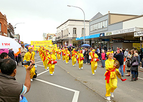 今年有八十多个团体参加了游行,法轮功学员和天国乐团也再次应邀参加了此庆祝活动,并受到沿途十万多观众的喝彩和欢迎。
