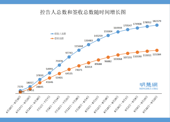 到本周9月22日,已超过十八万二千名海内外法轮功学员及家人真名实姓向中国最高检察院、法院控告江泽民,敦促对江泽民立案公诉。