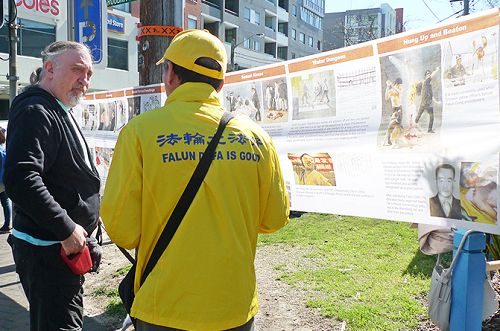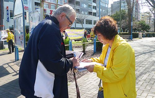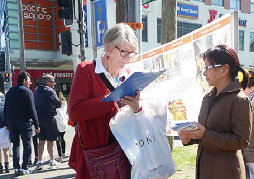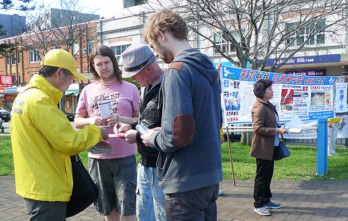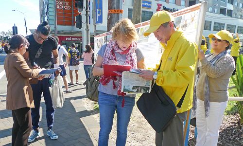 自二零一五年四月澳洲SBS电视台Dateline专题报导纪录片《活摘》(Human Harvest)后,中共非法活摘法轮功学员器官的真相持续在澳洲社会广泛传播。很多澳洲民众非常关注此事态的进展,只要在街上看到“活摘”真相摊位,就会驻足了解,并签名支持制止“活摘”。当天有好多位民众表示他们在电视上看到了纪录片《活摘》,感到非常骇人听闻,这些善良的西方民众被这个真相所震惊,纷纷询问为什么在中国会发生迫害法轮功这么残忍的事,如何能尽快制止对法轮功的残酷迫害。有的含着眼泪签名支持制止“活摘”。