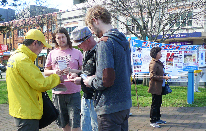 在举报江泽民的征签表上签名的民众中还有华人,他们了解真相后,不但签名举报江泽民,并现场做了三退(退出中共邪党、团、队组织)。其中一位来澳洲二十多年的北京华裔,签名后还进一步了解到“天灭中共,三退保平安”,并做了三退。他表示支持法轮功的不懈努力,和对中共的控诉。