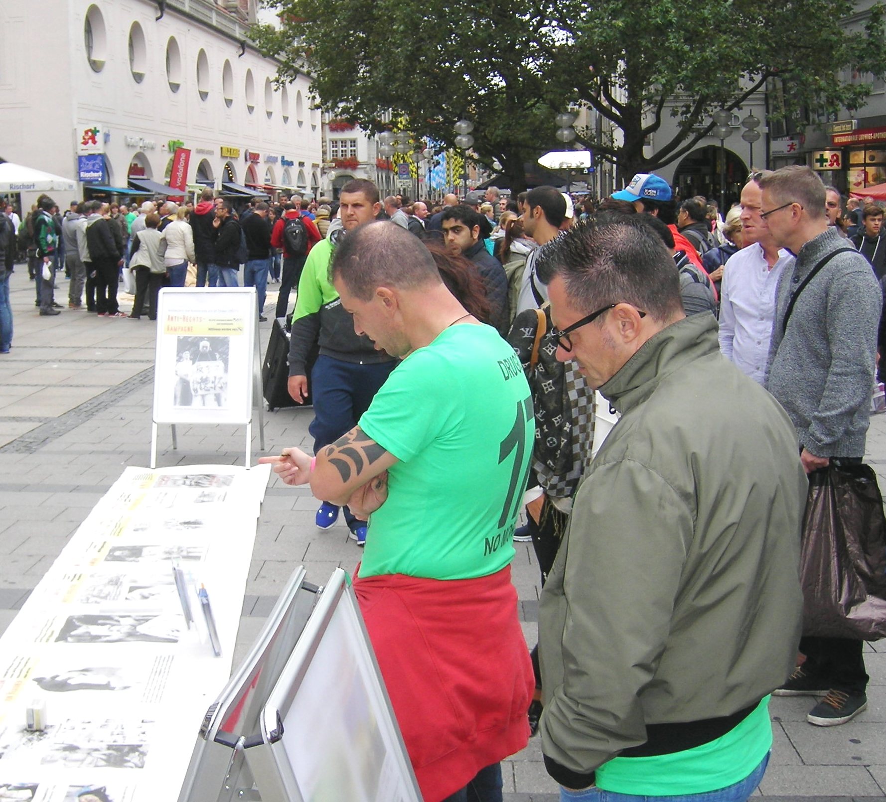 有一些西方人开始并没有在“反对中共活摘法轮功学员器官”的征签板上签名,他们拿着传单边走边看,看明白之后,立刻赶回来签名。