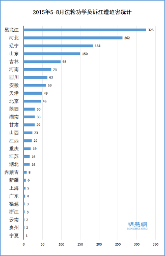 其中五月份发生迫害的只有甘肃,山东。六月份前六名:河北49人,辽宁13人,吉林9人,天津8人,河南8人,江苏7人。七月份前六名:黑龙江271人,山东68人,河北61人,辽宁59人,安徽43人,吉林39人。八月份前六名:河北152人,辽宁112人,山东75人,黑龙江52人,吉林50人,河南40人。