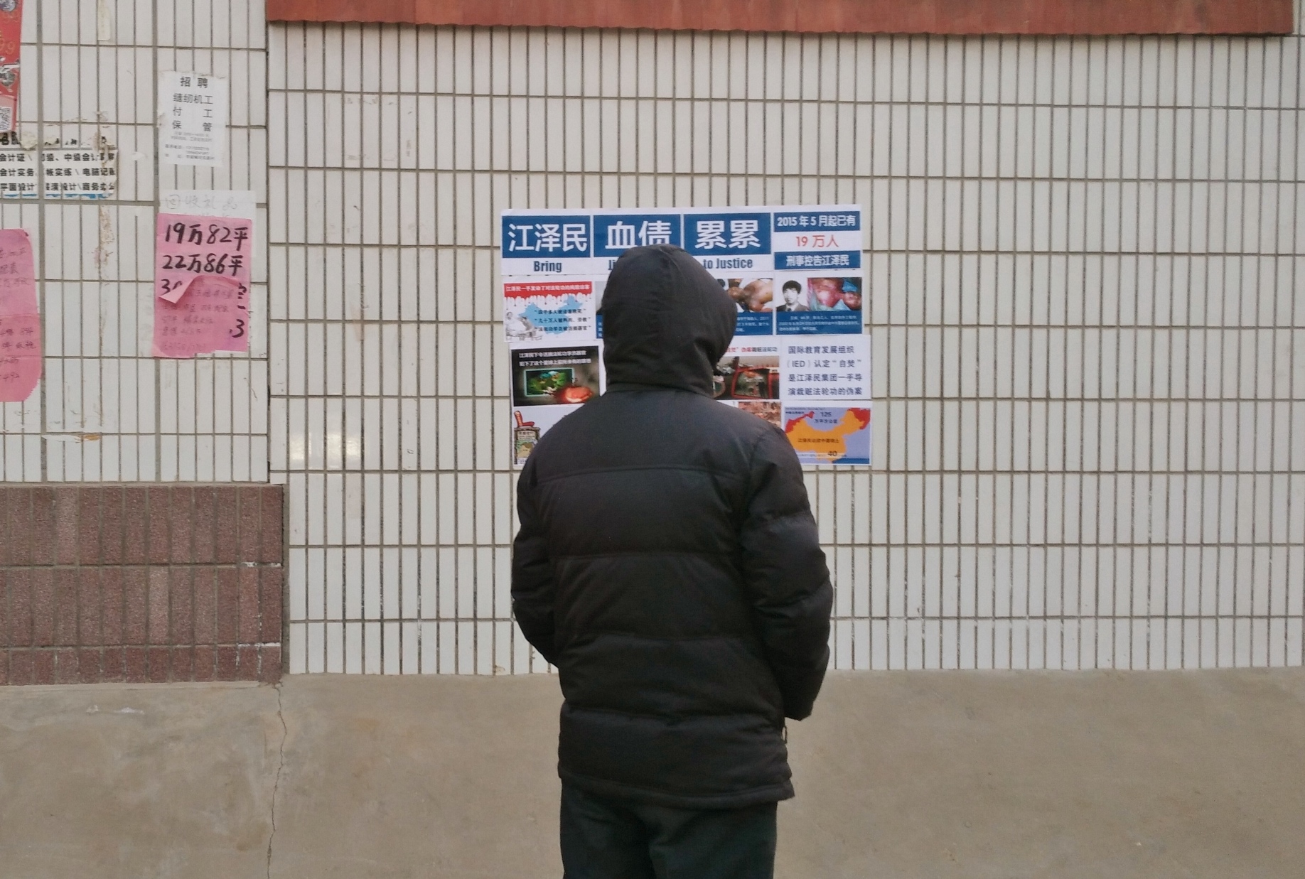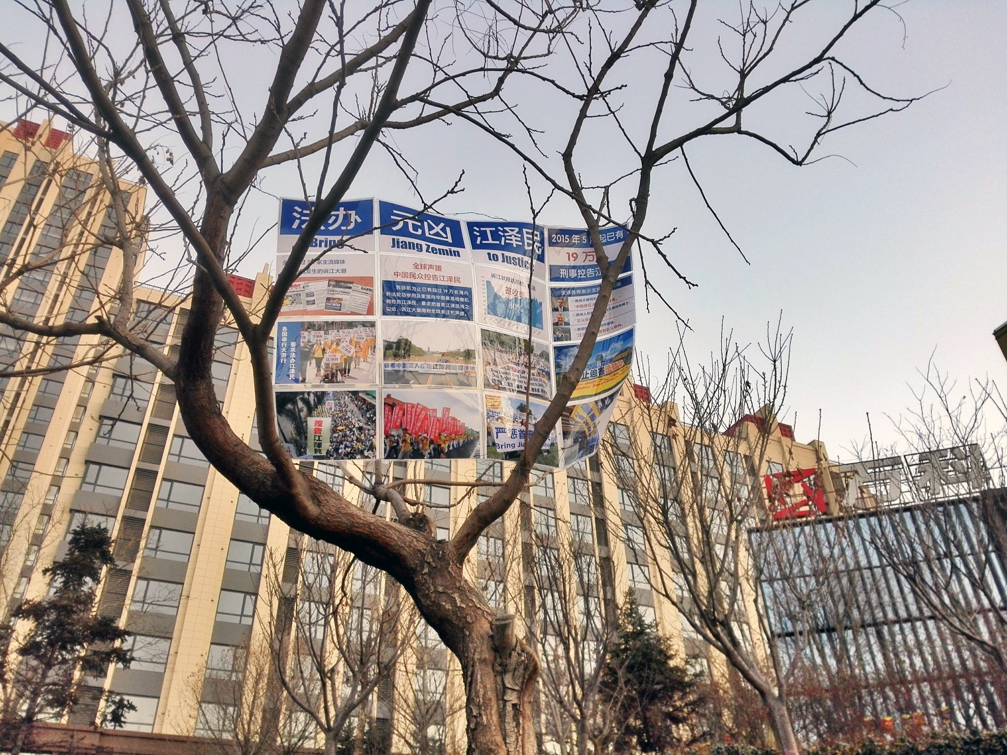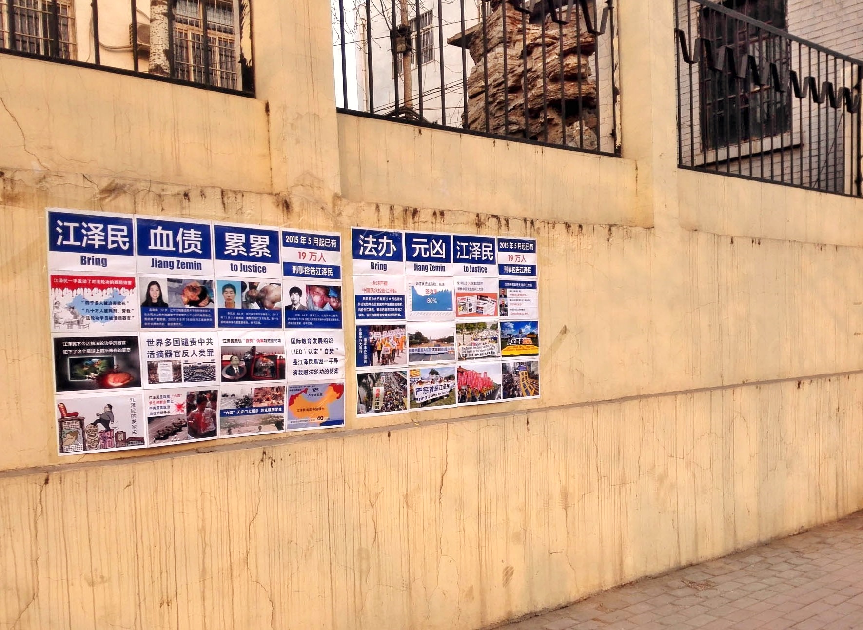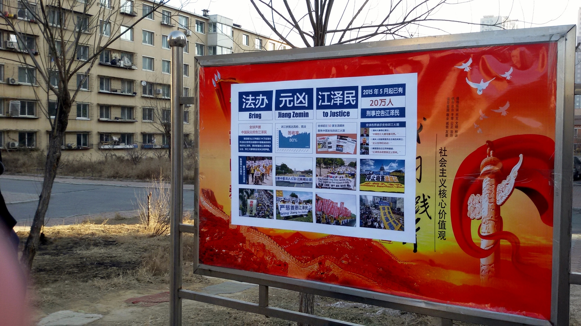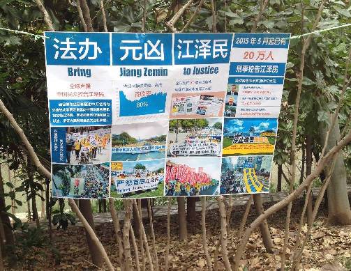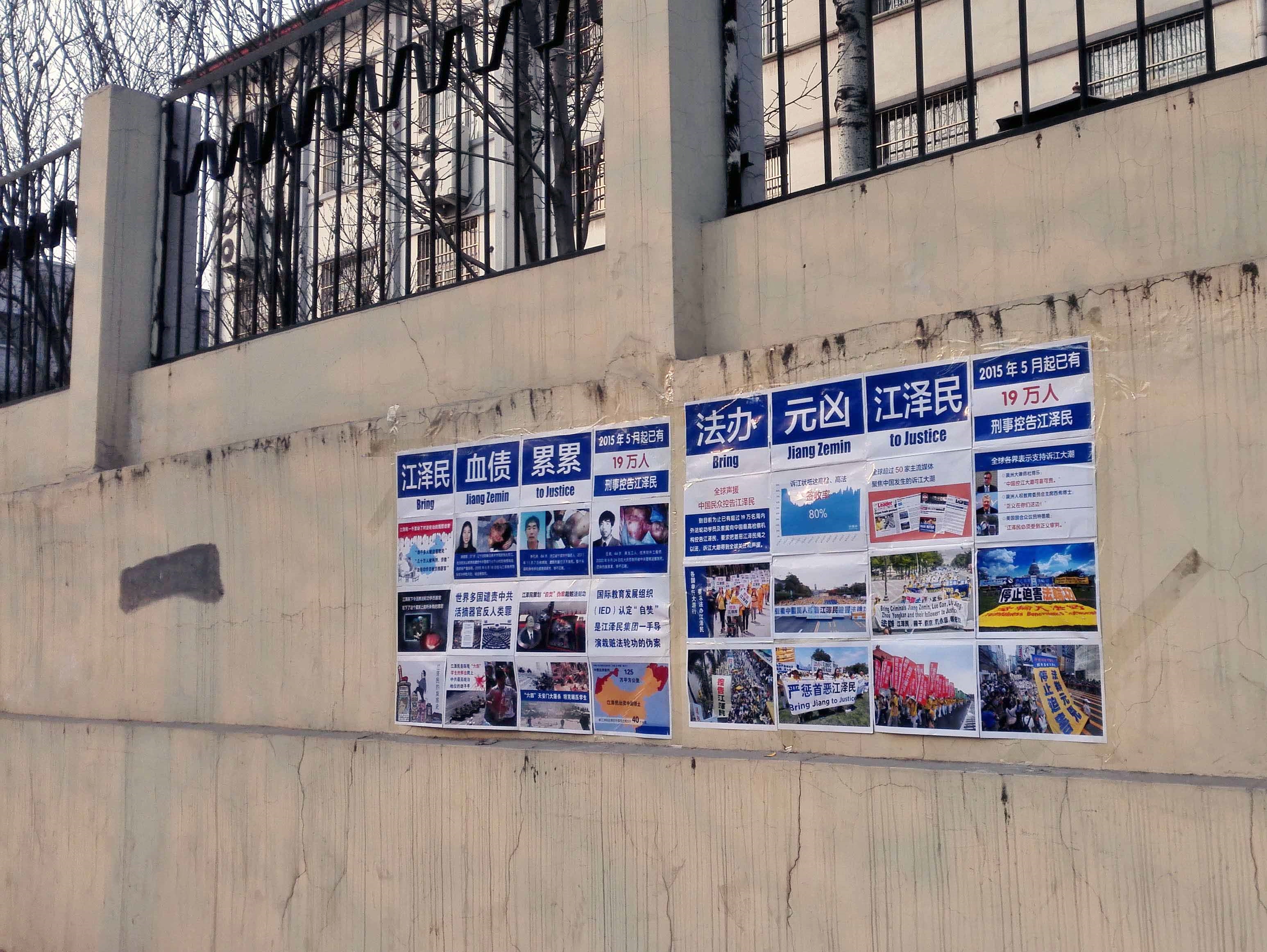 【明慧网二零一六年一月二十三日】二零一六年新年期间,中国大陆从北到南许多城镇的街头巷尾、居民住宅区、集市出现“法办江泽民”的展板,吸引路人驻足观看。