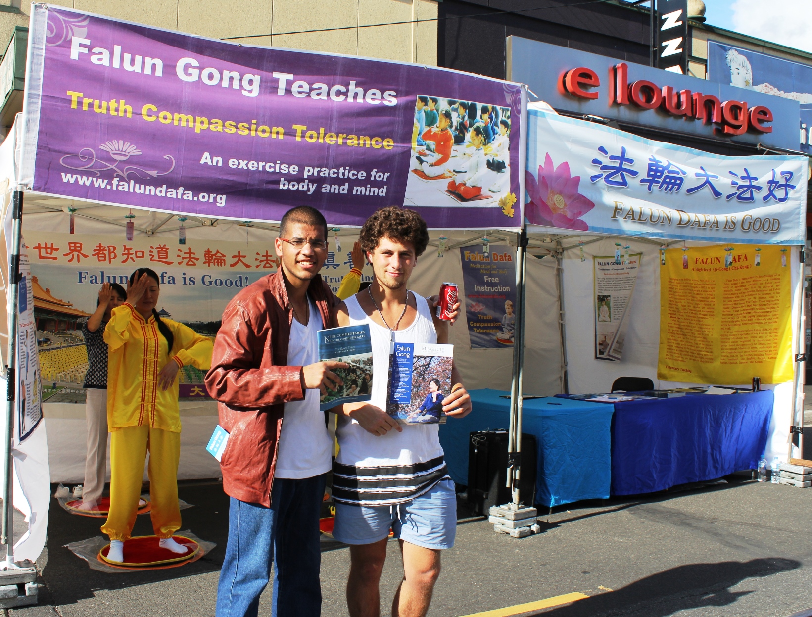 法轮功学员张女士说,上午开始发资料后不久,就先后有三个来自大陆的华人现场做了三退(退出中共党、团、队)。