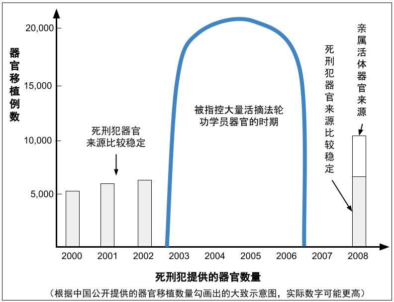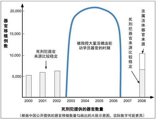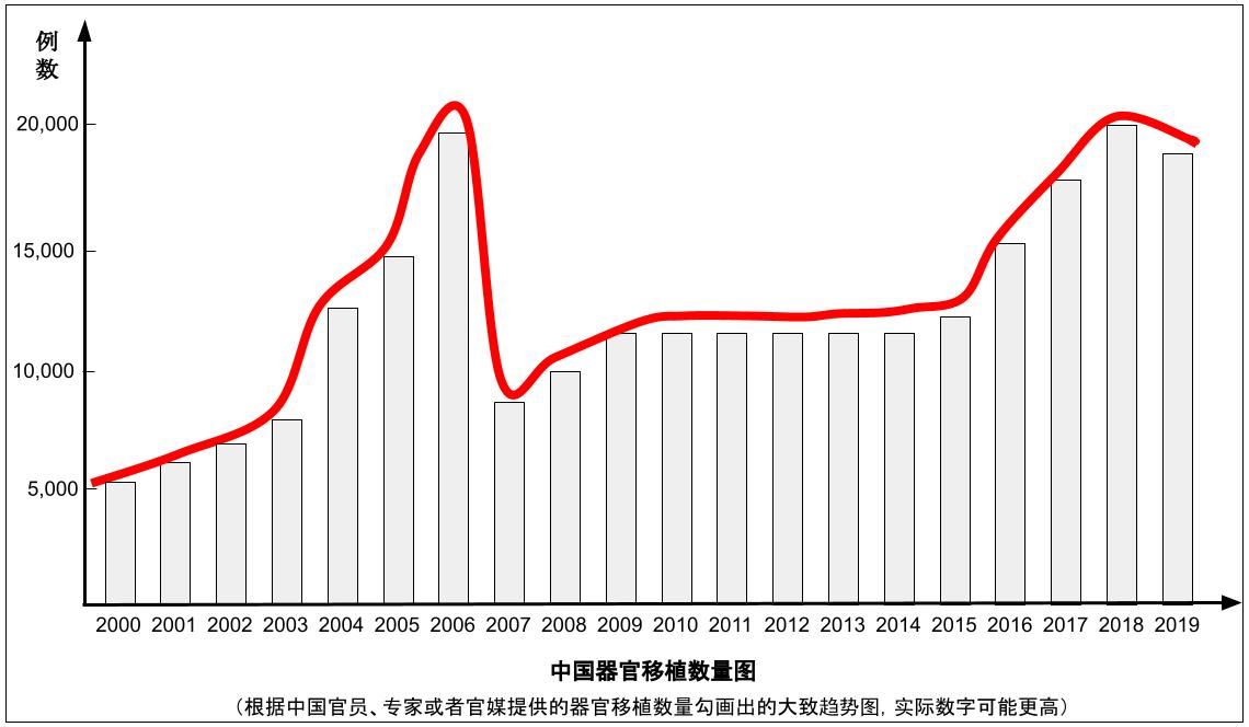 根据中共自己提供的器官移植数据,我们可以勾画出从2000年到2020年的大致曲线,虽然外界相信真实的数字要高得多。