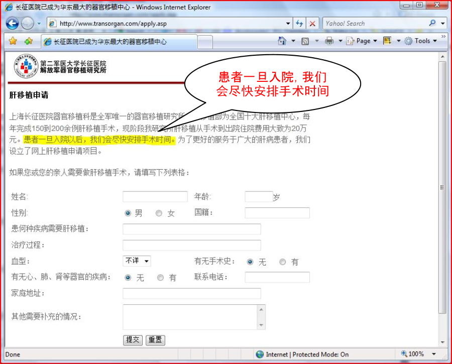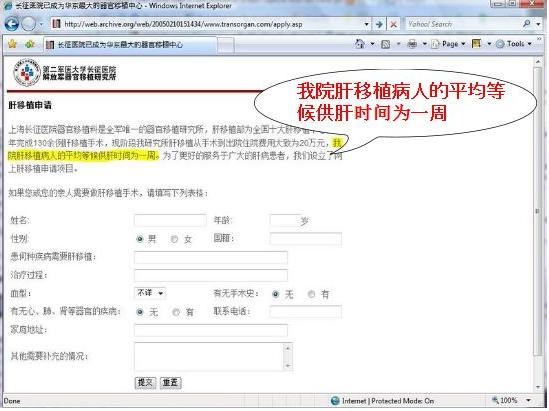 [145]天津东方器官移植中心网站首页上显示的“肝移植成果图”. 原文被删,存档链接: https://web.archive.org/web/20060412162605/https://www.ootc.net