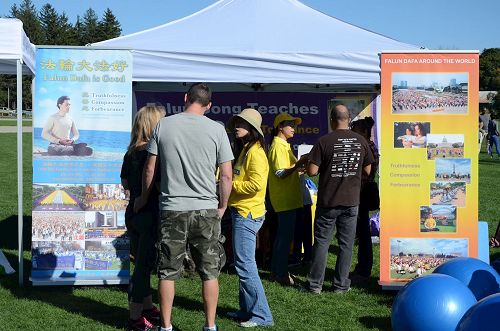 在早晨学员们刚布置好展位时,从事家庭和儿童服务的特瑞莎(Teresa)女士就过来问候,在了解了法轮功在全球洪传和祛病健身奇效的情况后,非常感兴趣,还拿走了法轮功的传单和《明慧周报》,逐字逐句地阅读了起来。