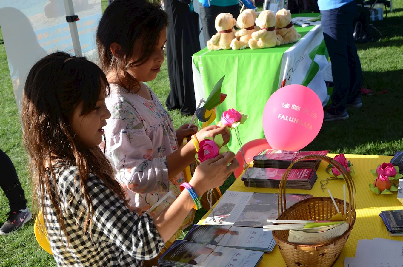 ![]() 图4:年轻的女孩子们被法轮功学员展位上摆放的精致莲花吸引 |