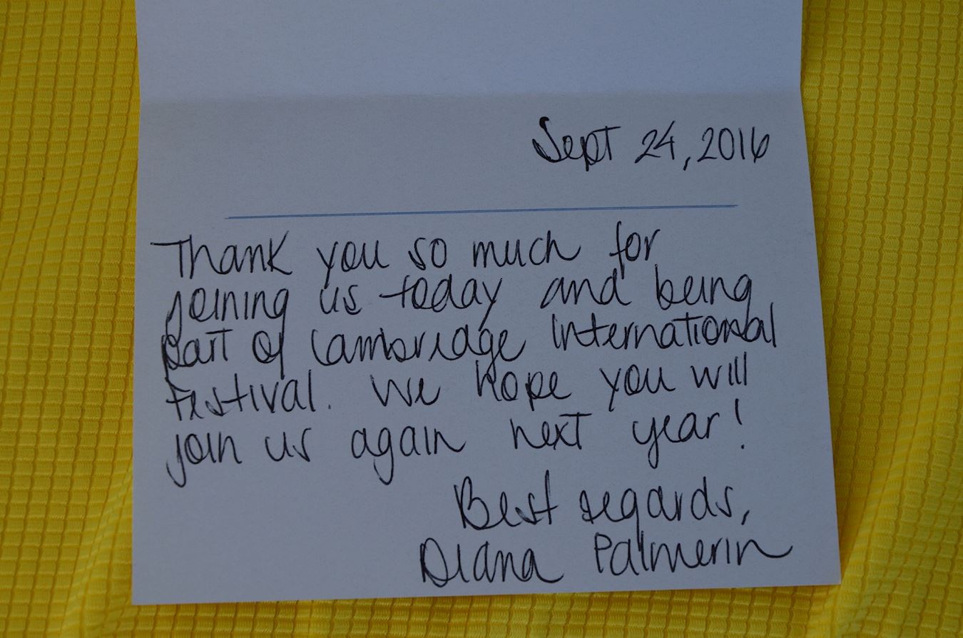 ![]() 图8:主办方代表戴安女士送给学员的感谢卡片并邀请明年再来 |