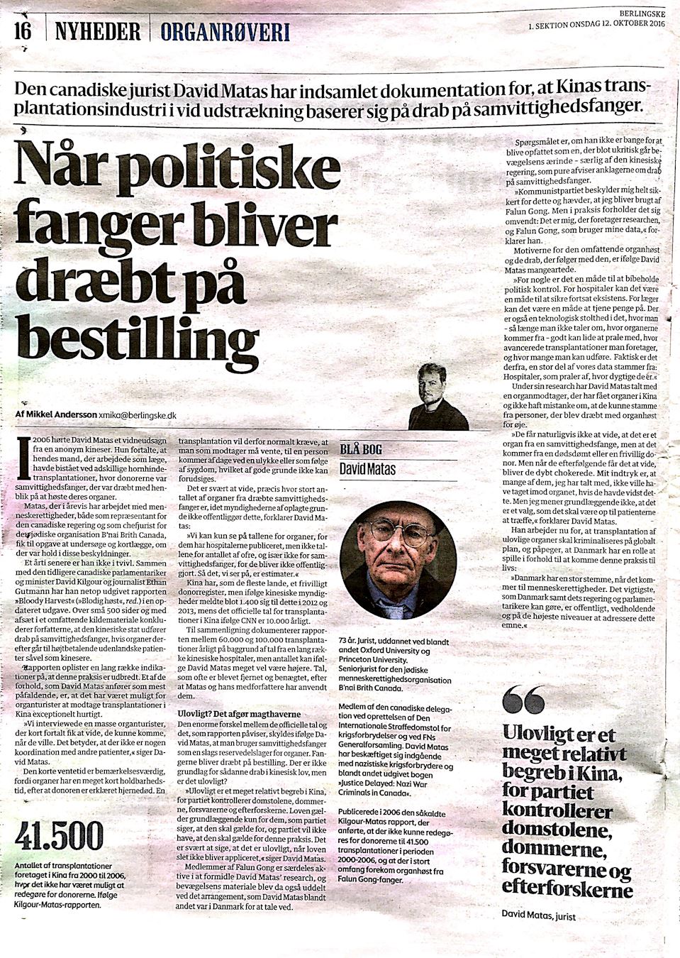 这两篇文章占据了该报两个整版的篇幅,深入报道了记者在加拿大著名人权律师大卫·麦塔斯访问丹麦期间,对他所进行的独家专访。文章详细介绍了麦塔斯与加拿大外交部亚太司前司长大卫·乔高对发生在中国的大规模活体摘取器官所进行的十年之久的独立调查过程,以及他们与另一位独立调查员,记者、作家伊森·葛特曼共同合作推出的最新调查报告 ——《血腥的器官摘取/大屠杀:更新版》(Bloody Harvest/The Slaughter :An Update)。