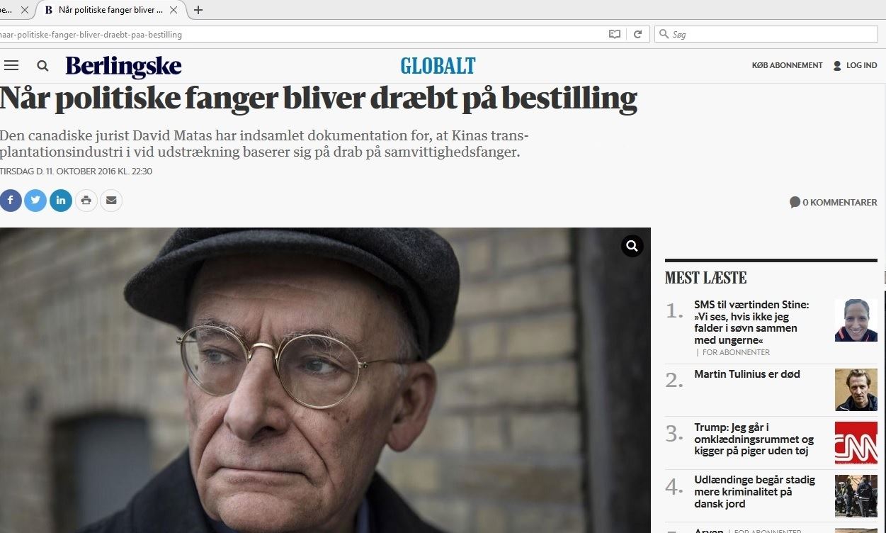 ![]() 丹麦报纸《贝林报》刊登两篇文章:“当政治犯被按需杀戮时”和“信仰者被当作器官库” |
