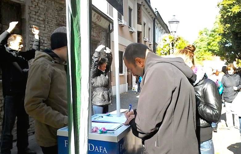 【明慧网二零一六年十月十八日】二零一六年十月十五日,德国部份法轮功在德国西南端的菲林根-施文宁根(Villingen-Schwenningen)古城,举办了反迫害征签日活动。