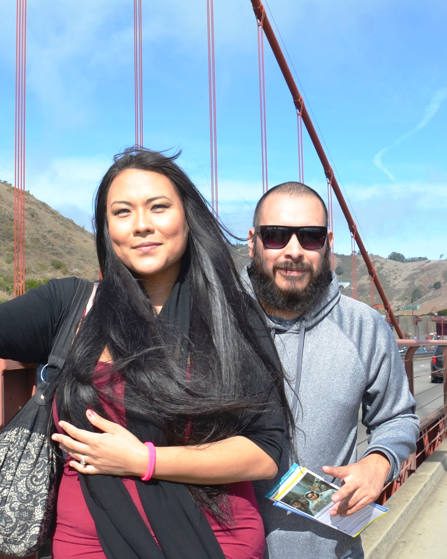![]() 图8:居住南加州 St. Monica地区的记者 Esvim和助手Les在金门大桥遇见了法轮功学员游行。 |