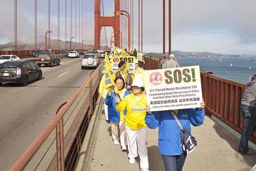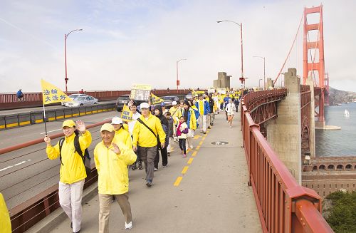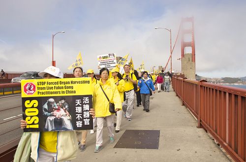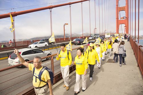 二十三日上午,法轮功学员在金门大桥广场集体炼功,然后举着“法轮大法好”的小旗帜和“停止活摘器官”的展板,步行跨越金门大桥,向远道而来的中国及世界各地游客展示法轮功的美好祥和,为他们讲述法轮功在中国无辜受迫害的真相。经过桥梁的汽车川流不息,看到法轮功队伍时,有的司机摇下车窗向学员竖大拇指,有的鸣笛表示支持。人行道上的游客在观光的同时很多人都停下来接过传单,听学员讲真相。有的华人还现场声明退出中共相关组织。