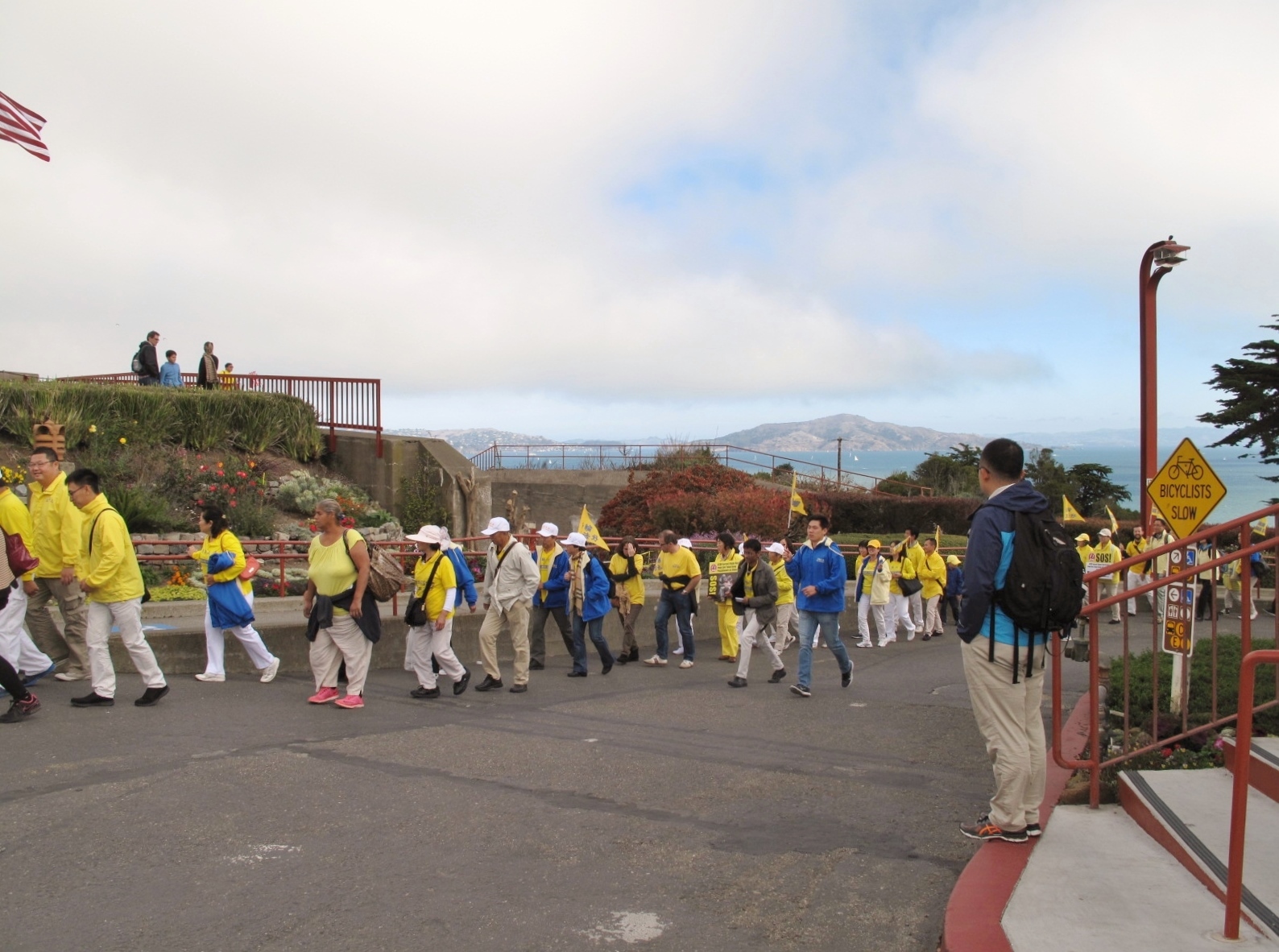 在法轮功游行队伍即将出发、走向金门大桥前,一位从大陆来旧金山出差,顺便参观金门大桥的年轻男子,刚好走到法轮功队伍旁边,随后的两个多小时,他一直跟着学员的游行徒步走个来回。