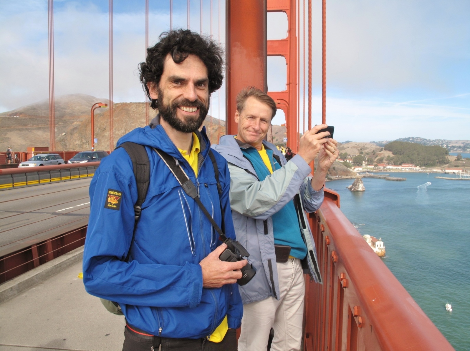 来自苏格兰的斯蒂芬(Steven)和来自英格兰最南端康沃尔的特瑞沃(Trevor)二十三日在反迫害游行中结伴而行,一起徒步走过金门大桥,都是专业摄影师的他们在回程路上驻足拍下一副旧金山湾海景。
