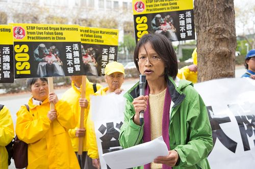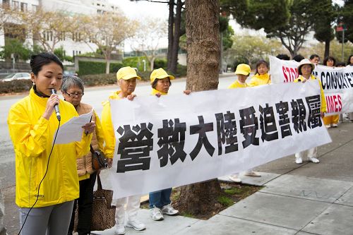 【明慧网二零一六年十月二十七日】(明慧记者舒静、穆文清旧金山报道)二零一六年十月二十五日上午,部份来自各地的法轮功学员在旧金山中领馆前举行集会,多位法轮功学员讲述了他(她)们在大陆的亲人因修炼法轮功而遭受中共迫害的经历,并呼吁各界帮助营救。