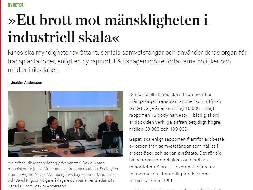 瑞典最大的医学专刊《医生报》周刊于九月二十八日,为此在其网络版上刊登了题为“工业化大规模反人类罪”的专题报导。该周刊是“瑞典医生协会”成员人手一份的医学专刊,也是欧洲最重要的医学杂志之一。