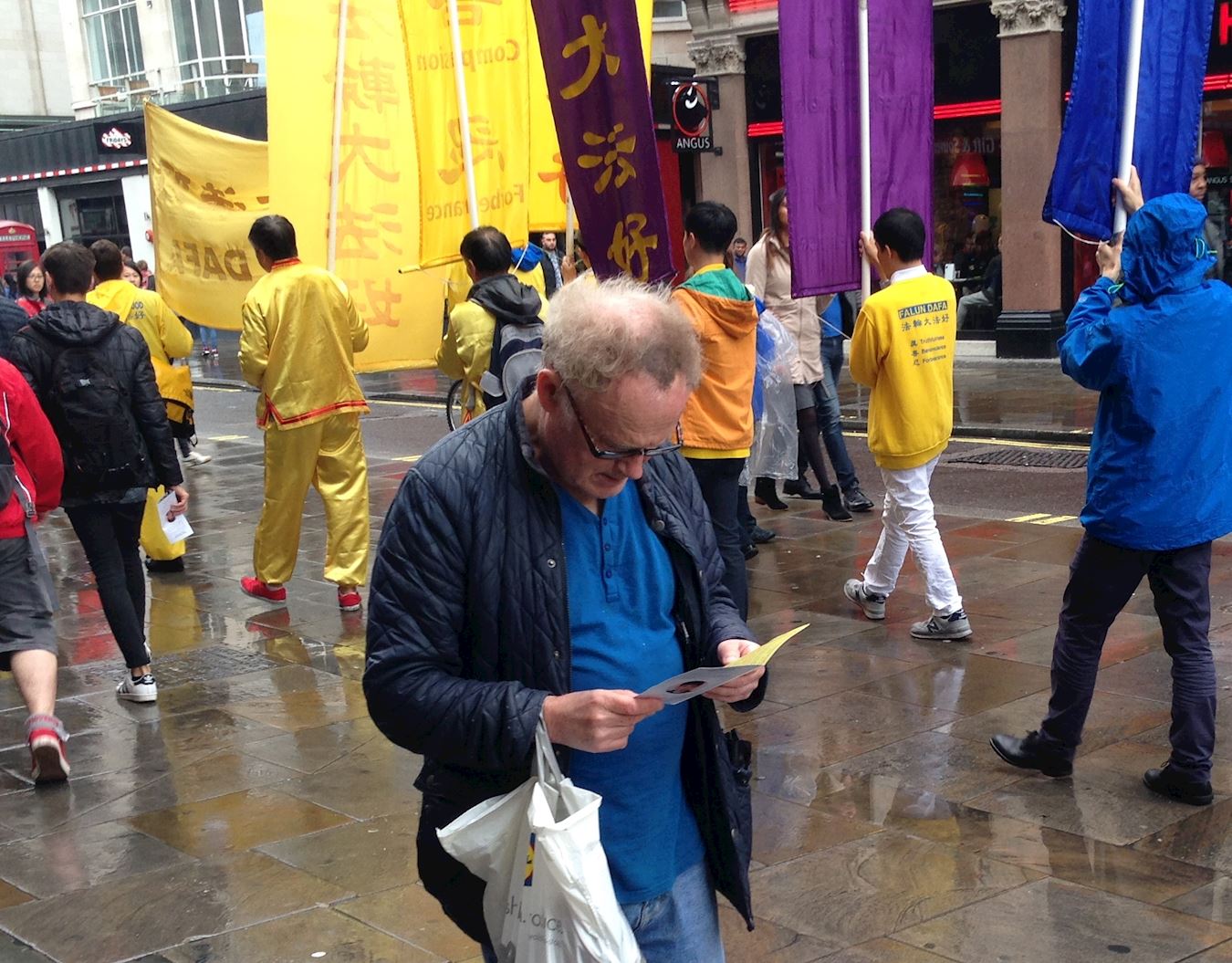 法轮功游行队伍行进到皮卡迪利广场(Piccadilly Circus)附近的宽阔人行道上时,一位老年西人男士接过传单后立即停下脚步聚精会神阅读。这位老先生叫查尔斯,是爱尔兰人,在伦敦生活二十多年了,退休前是伦敦一家医院的护士。他表示自己知道法轮功,听说过在中国有盗卖人体器官的现象,但这是他第一次了解到中共大规模活摘法轮功学员器官的信息,这让他震惊,迫不及待想了解为什么会有这样难以置信的罪恶发生。