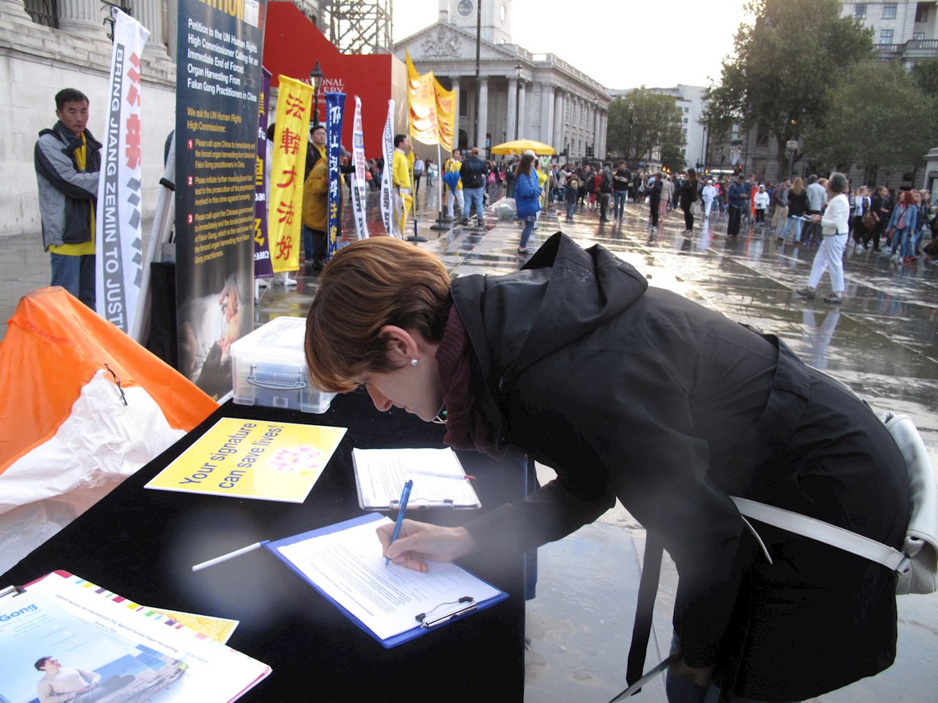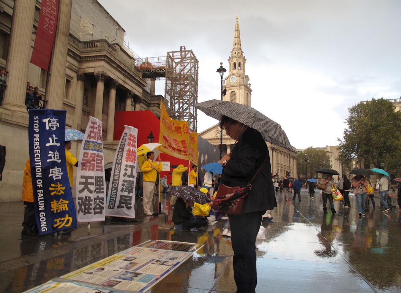 当天,天下了一会儿暴雨,法轮功学员冒雨继续进行讲真相活动,英国女士玛丽是一位护士,看到法轮功学员冒雨演示功法,她走过来观看,并认真阅读真相展板。