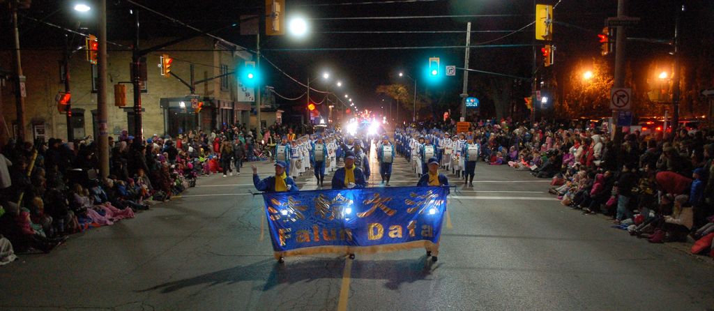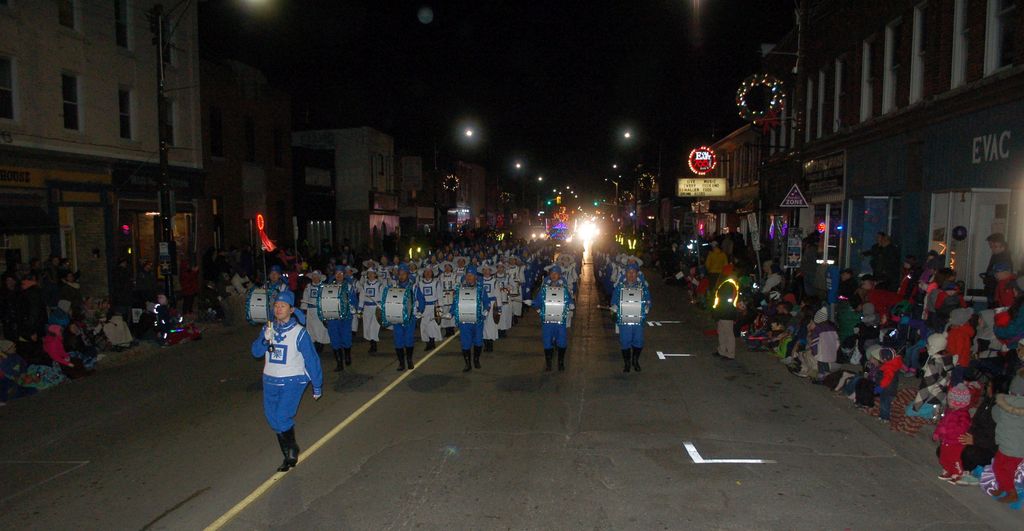 美丽的花车、耀眼的彩灯、多元化的乐队以及优美动听的音乐,令观众陶醉其中,忘记了寒冷,忘记了黑夜,眼中脸上满是欢喜之情。在众多的花车和乐队当中,法轮大法代表队被排在了最重要的位置——压轴,其后紧跟的就是圣诞老人车队。