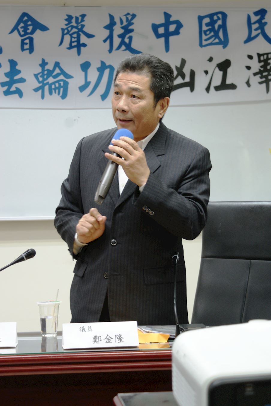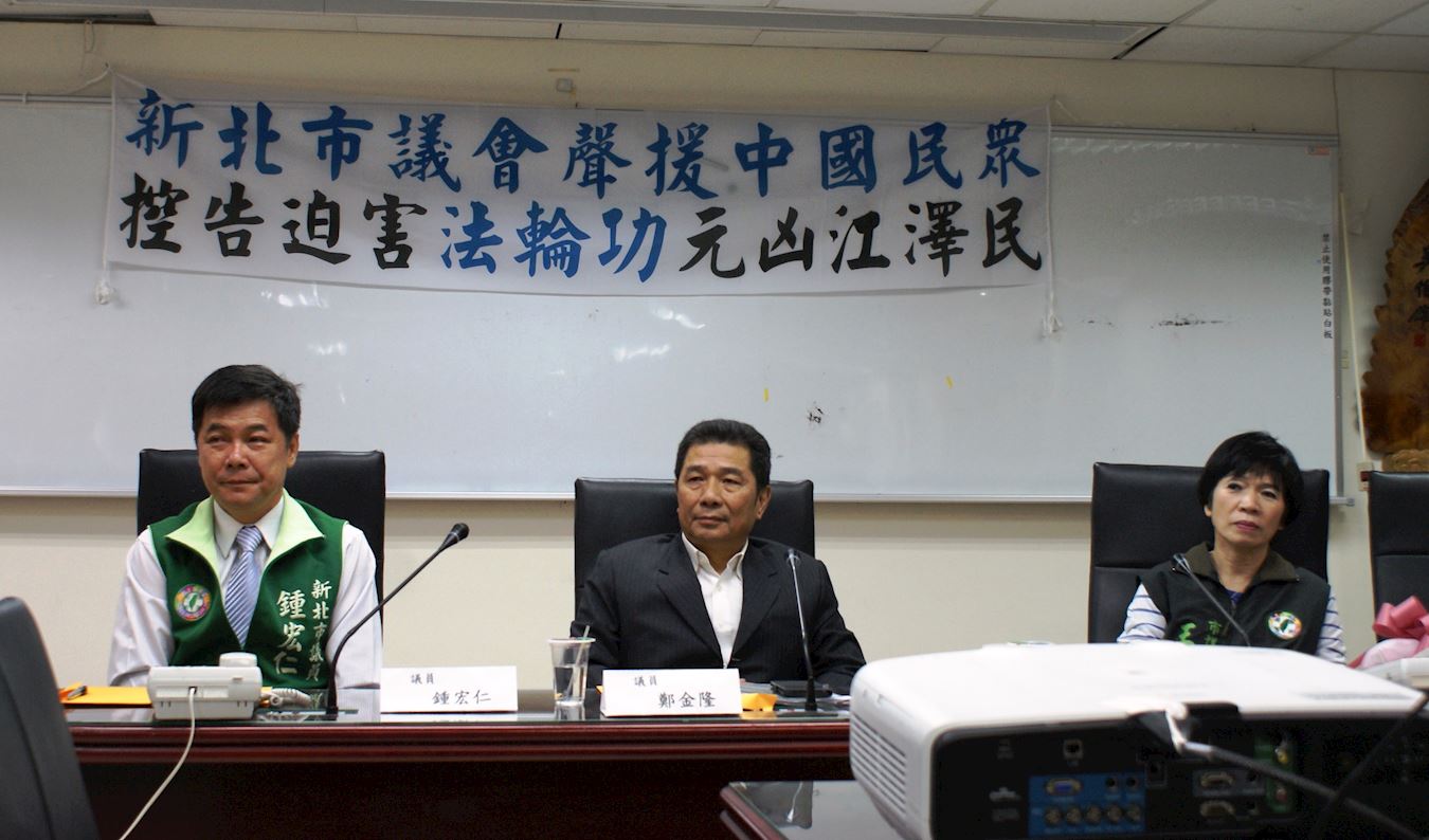 ![]() 图2:二零一六年十一月十一日,在新北市议会举行声援诉江座谈会,播映《活摘》纪录影片,图为与会议员,从左至右:钟宏仁、郑金隆、王淑慧。 |