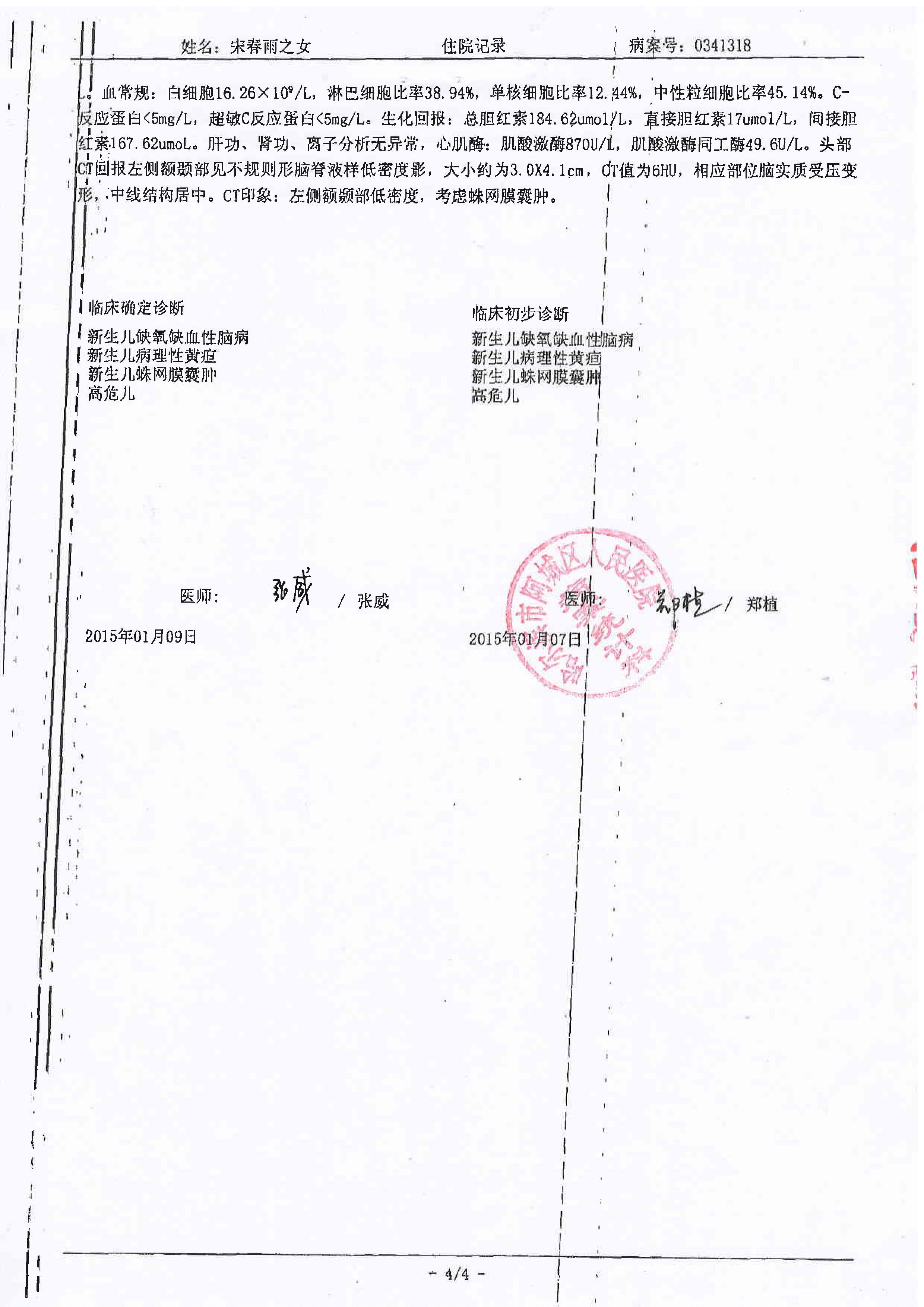 ![]() 图1:外孙女出生时的病情诊断病例(部分)。 |