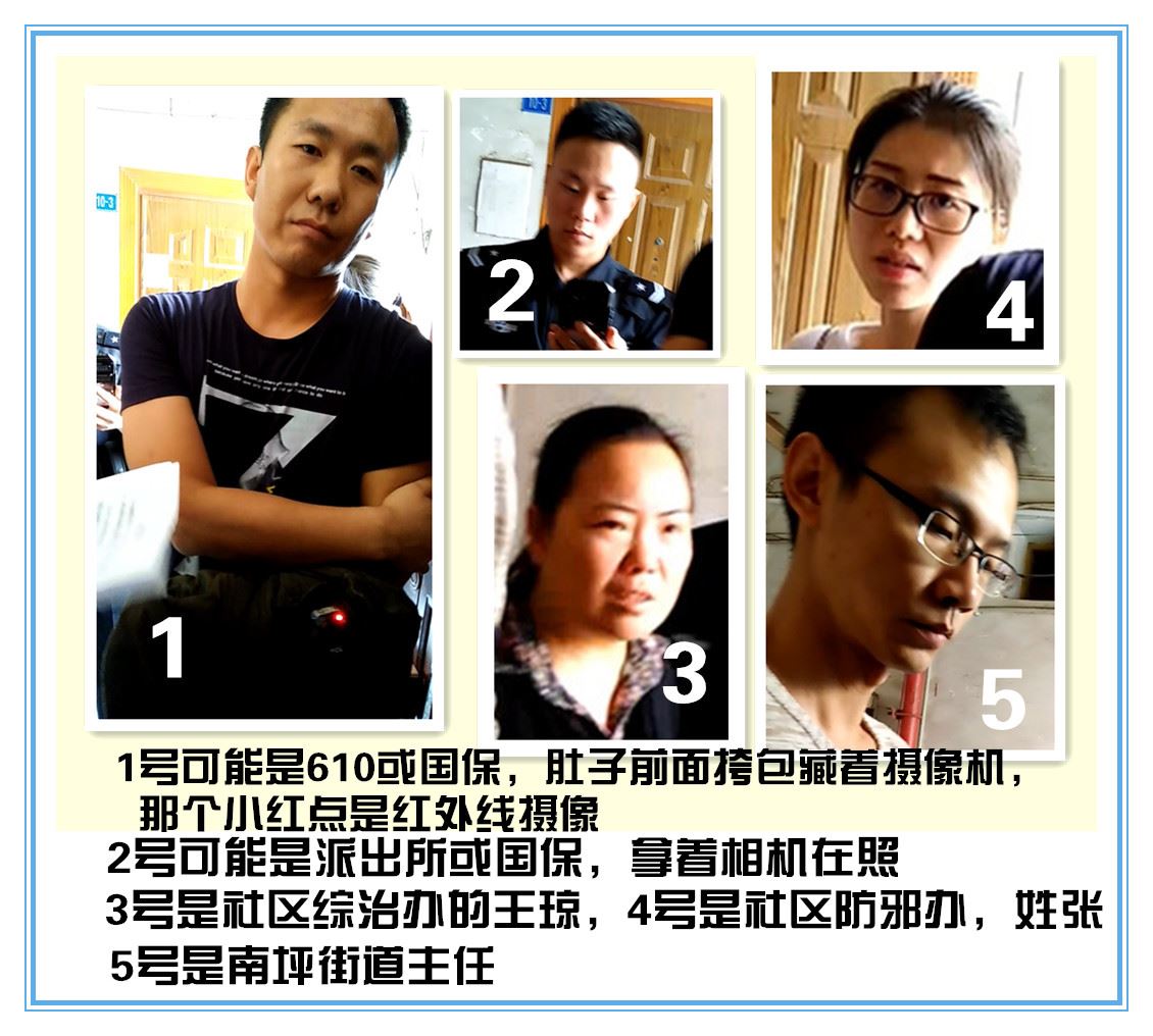 南坪派出所、南坪街道、阳光社区、茶园路警察:李党旗、高嵬、明佳圆居委会书记:候丽君、秦利、小区门卫:杜起其、张春华、国保610和综治办、茶园派出所、重庆铜元局派出所、双峰山社区,张燕、黄志诚、王主任、铜元局街道的吴俊平(音610人员)和综治办、铜元局派出所警察陈杰,双峰山社区王主任、黄志诚、铜元局巴蕉塆街道综治办负责人孙雪华,杜琴,楼长邓长惠等。