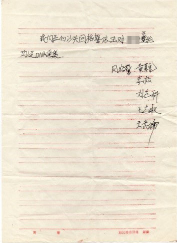 我拼命挣扎,也不知他们采了我多少血。他们松手后,我看那个所长不在了,敲门的那个先出门,副所长紧随后快步出门。我赤脚追上,拉回了副所长,要他们签名。他瞪大眼睛说:“你想干啥,要告我们吗?”我说:“当然了。”他稍想片刻后,回答说:“好,我们签,要告你就去告嘛。”