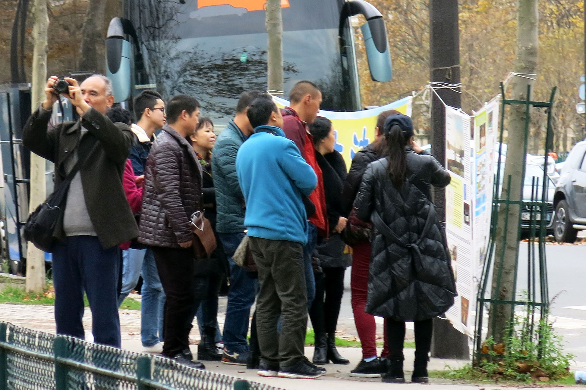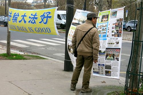 ![]() 图4-8 :来巴黎旅游的中国大陆游客经过世界著名的埃菲尔铁塔附近的法轮功真相点时,许多人驻足阅读真相展板,了解真相。 |