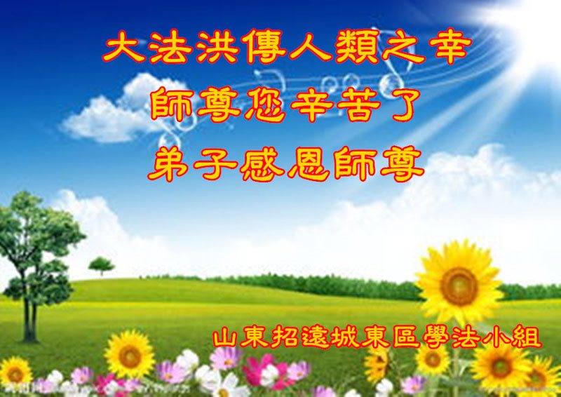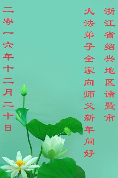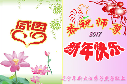 二零一七年即将来临,我向师尊问好!师尊辛苦了!我怀着无限崇敬的心情感恩师尊的苦度!中共邪党对修真、善、忍的法轮功学员实施了最严酷的史无前例的迫害。在迫害中我没有倒下。我在伟大慈悲师尊时时刻刻的呵护下,在风风雨雨中我已修炼了二十年了,我在兑现着正法时期大法弟子救度众生的誓约。在修炼过程中还有许多为名、利、情产生的人的心。请师尊放心,弟子听您的话,走您安排的路,多学法,学好法,遇事向内找,修好自己,做好大法弟子必须做的三件事。弟子盼望师尊早日回中国大陆!盼望神韵早日来中国大陆演出!