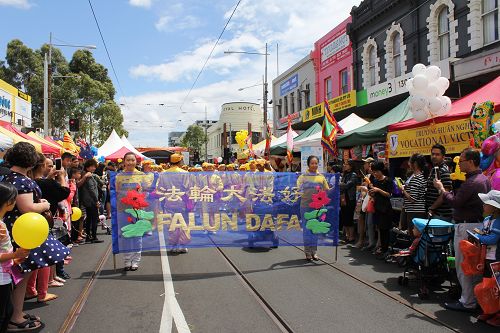 一月三十一日,墨尔本越南裔居民聚居的城区费茨格雷举办了一年一度的中国新年盛大节庆,墨尔本法轮功学员组成的腰鼓队应邀参加遊行表演。