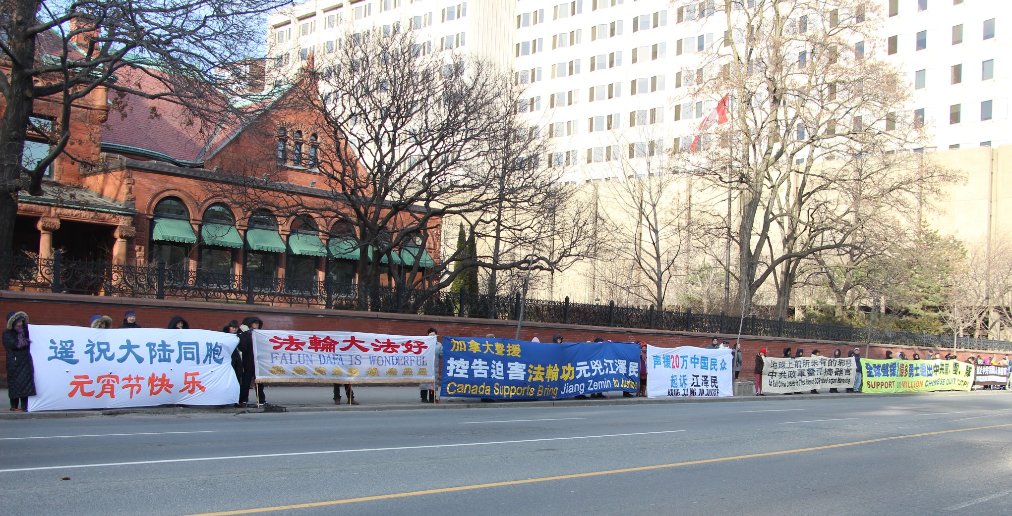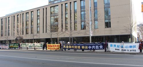 ![]() 图1-2:二月二十二日,多伦多法轮功学员在市中心的St.George街和Bloor街交界(靠近中领馆附近),展开横幅,声援诉江大潮 |