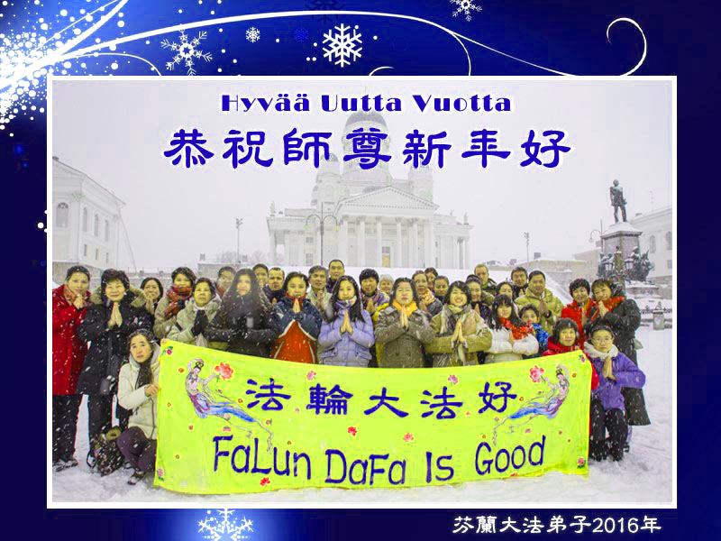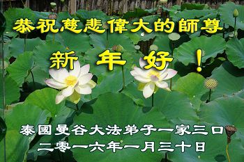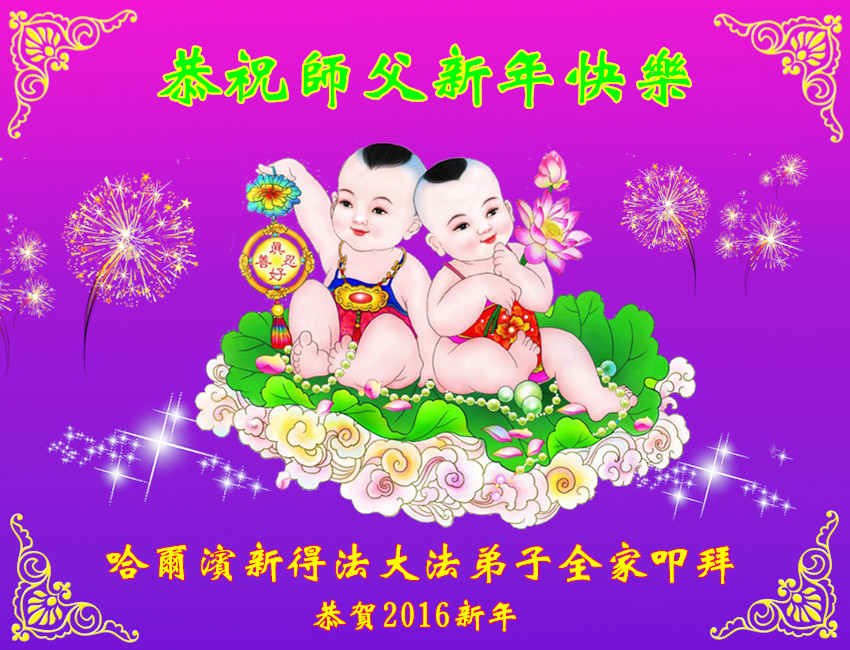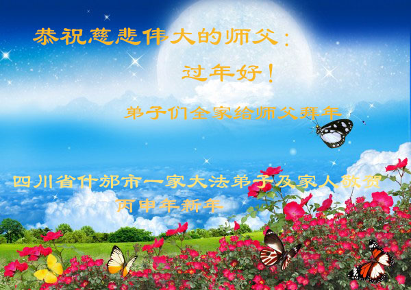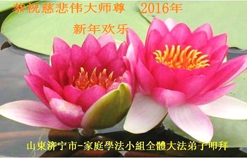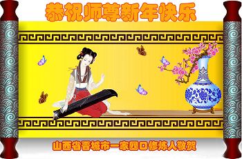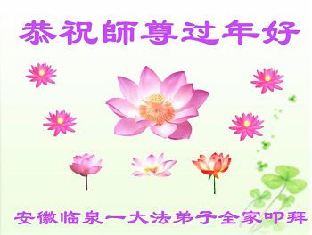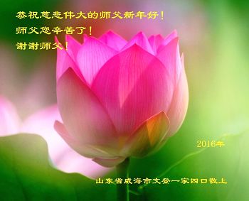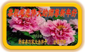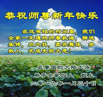 我们是明白真相的大法弟子的家人,虽然我们还没有真正走入修炼,但大法真、善、忍的精神早已经走入了我们心中,在认同支持大法弟子的同时,我们的身心都曾经受益匪浅!在新年来临之际,我们向伟大慈悲的大法师父真心的说一声:谢谢您!祝您新年快乐!早日回国!