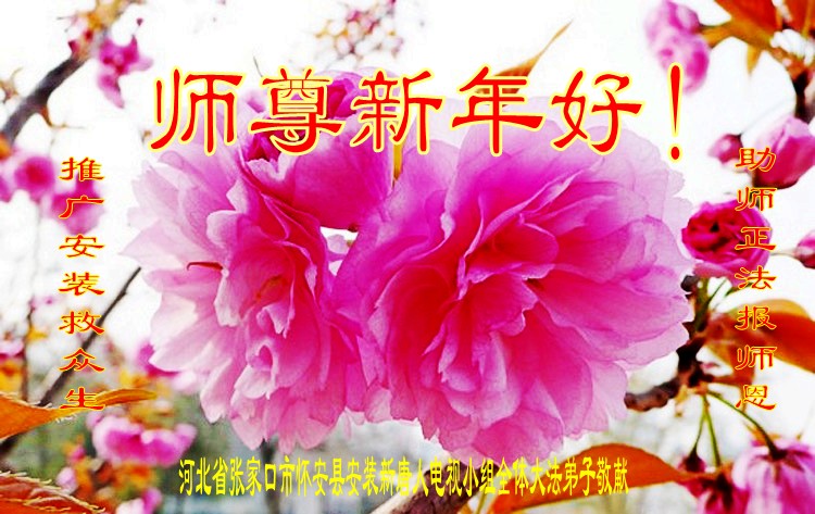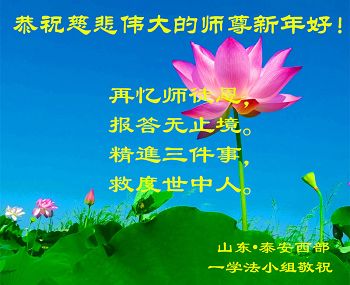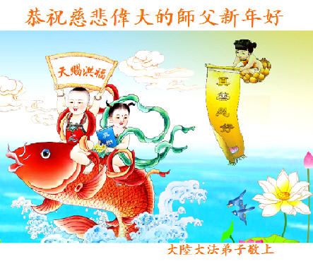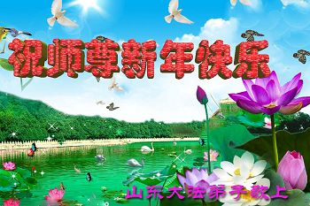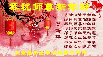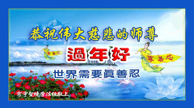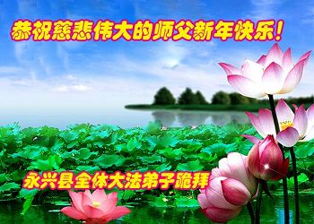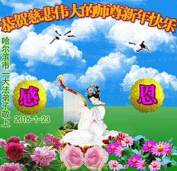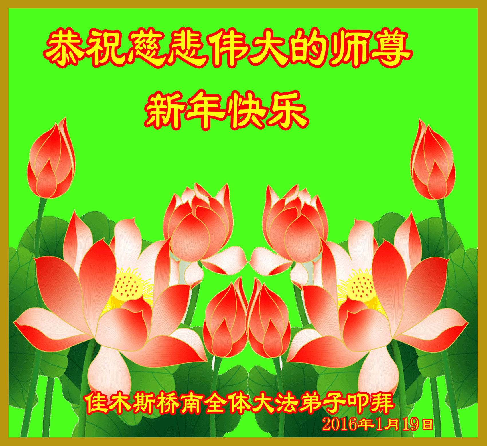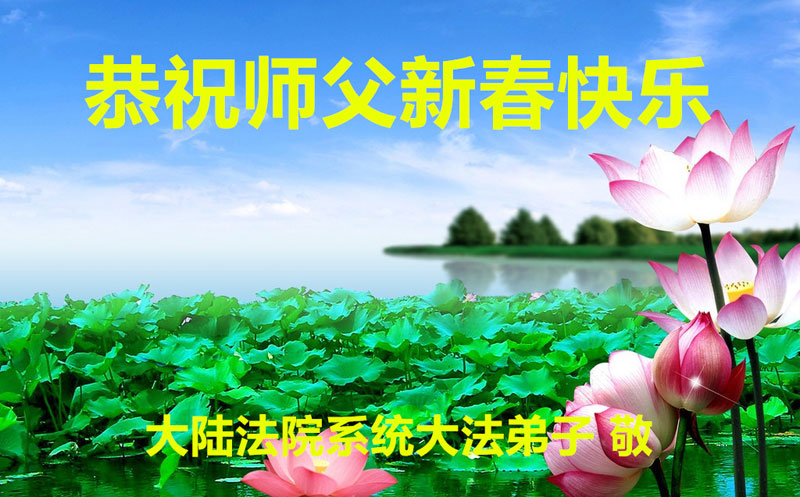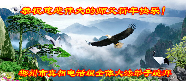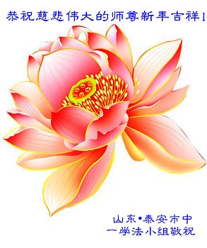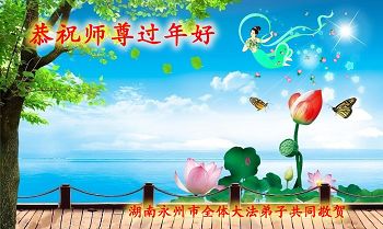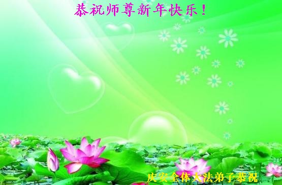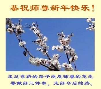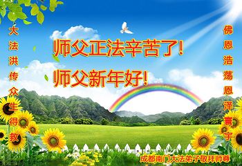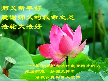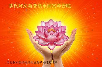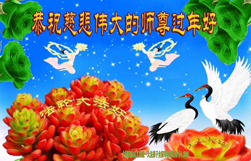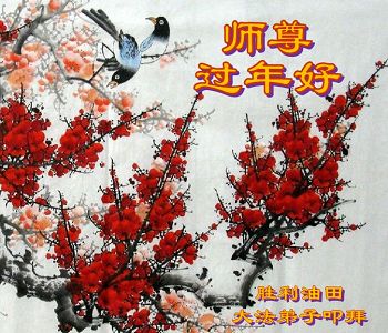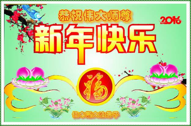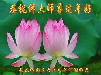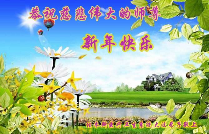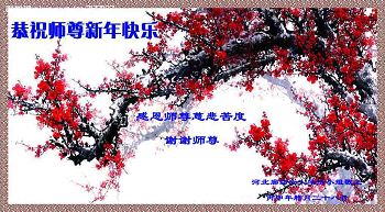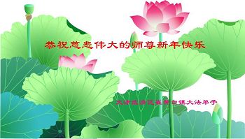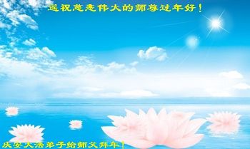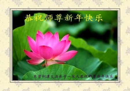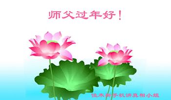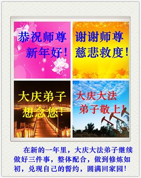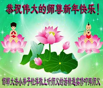 至尊无上的李大师新年好!穷尽人类的语言难以表达我们心中对李大师的无限感恩!法轮大法修炼者谨遵师命,按照真善忍的原则,遇事首先为他人着想的高贵品质,象一股清流涤荡着人类社会的一切邪恶!我们在此真心奉劝那些还被中共邪党蒙骗的世人,珍惜每一次法轮功弟子给你们的机会,明白法轮功真相,相信“法轮大法好”、“真、善、忍好”,给自己选择一个美好的未来!