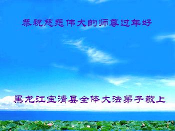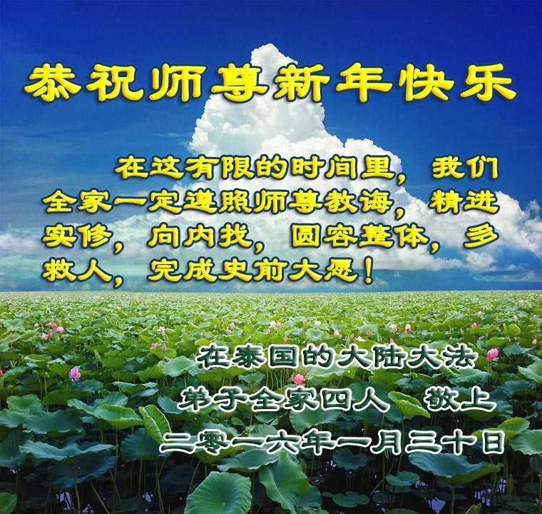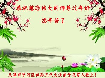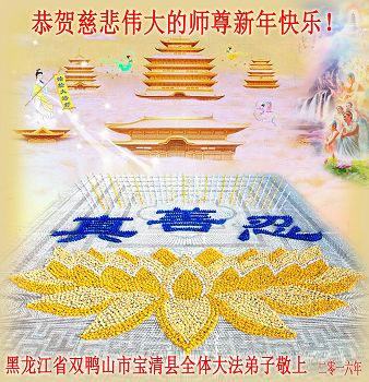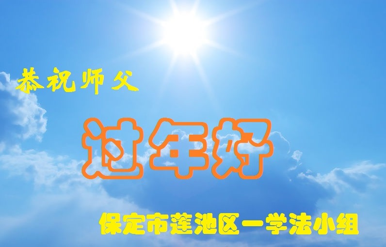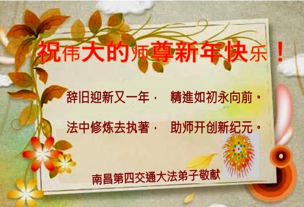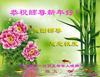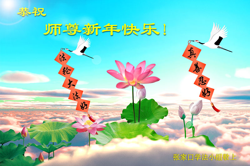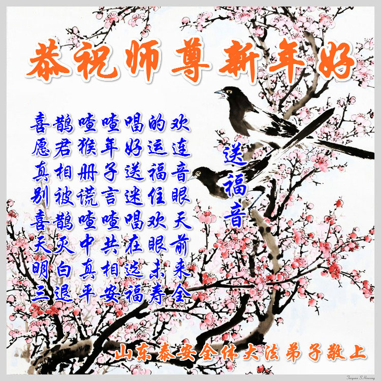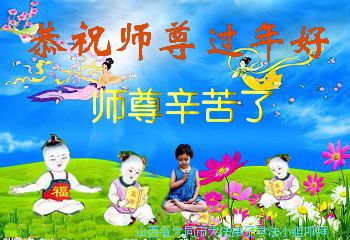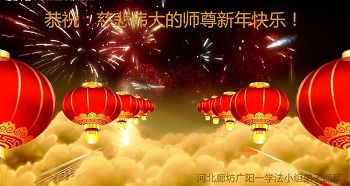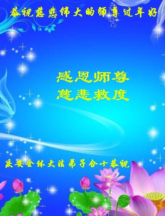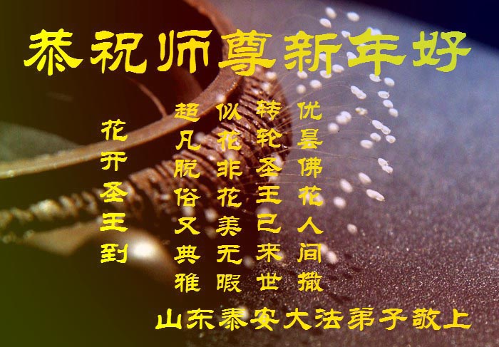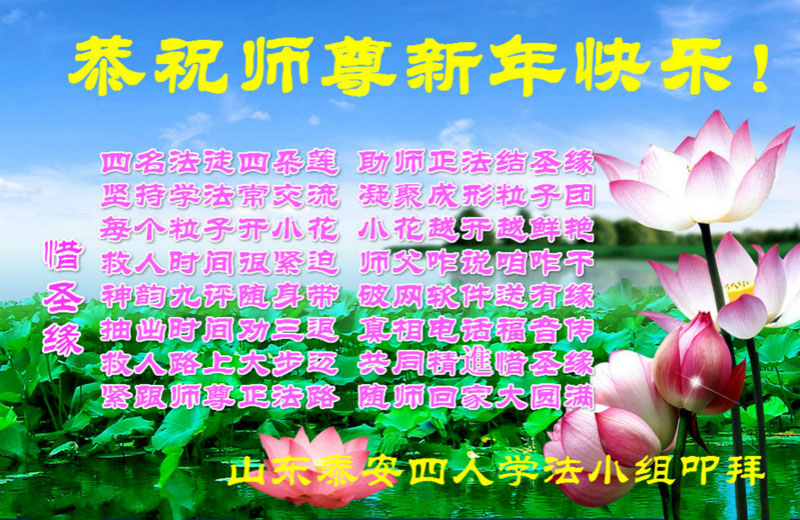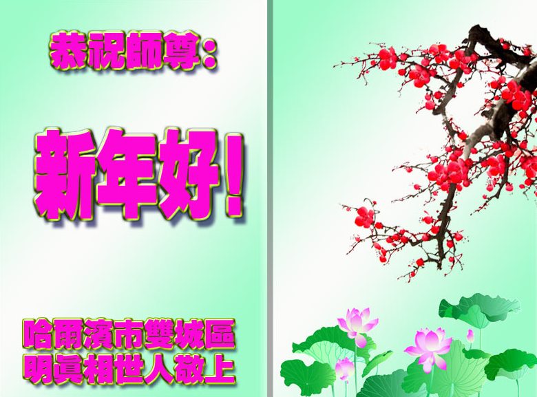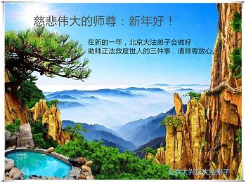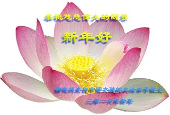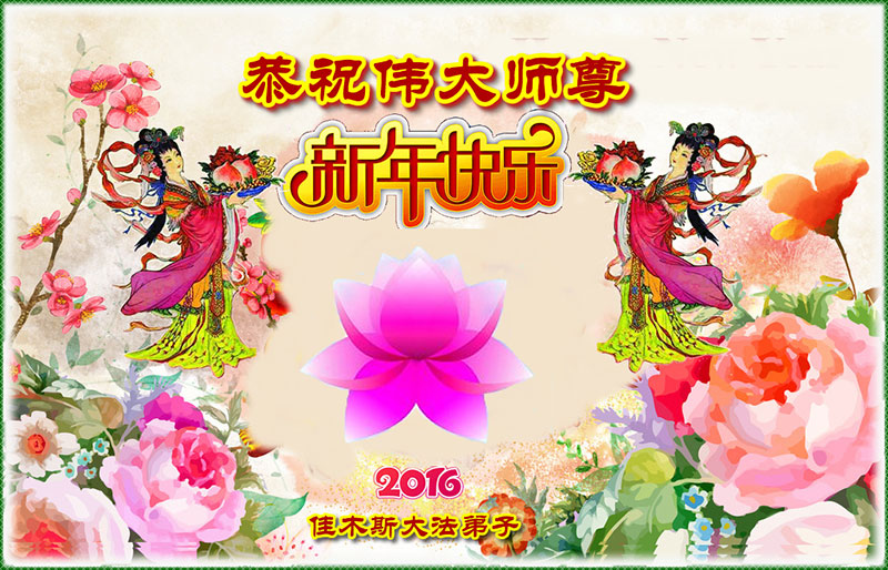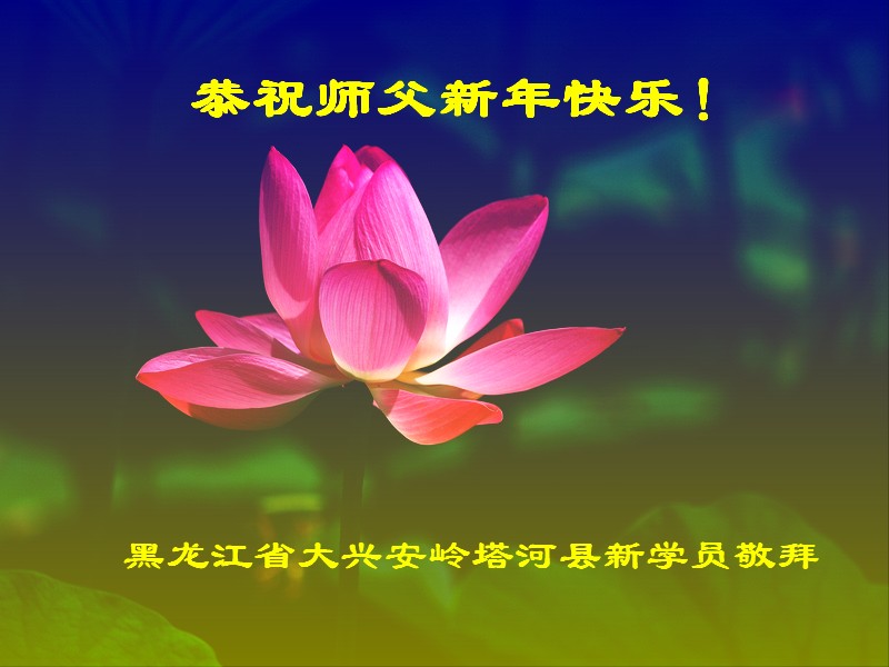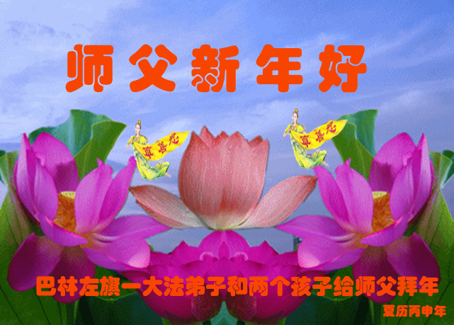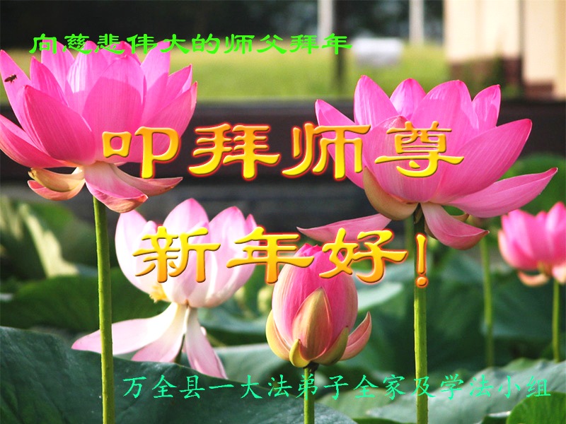 至尊无上的李大师新年好!穷尽人类的语言难以表达我们心中对李大师的无限感恩!法轮大法修炼者谨遵师命,按照真善忍的原则,遇事首先为他人着想的高贵品质,象一股清流涤荡着人类社会的一切邪恶!我们在此真心奉劝那些还被中共邪党蒙骗的世人,珍惜每一次法轮功弟子给你们的机会,明白法轮功真相,相信“法轮大法好”、“真、善、忍好”,给自己选择一个美好的未来!