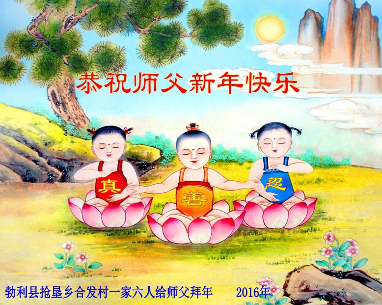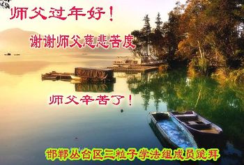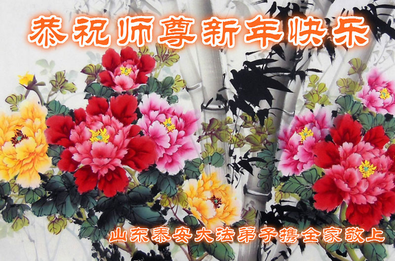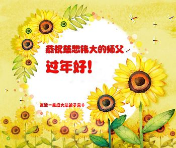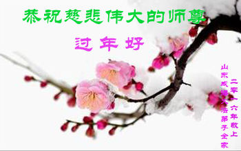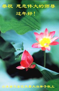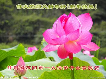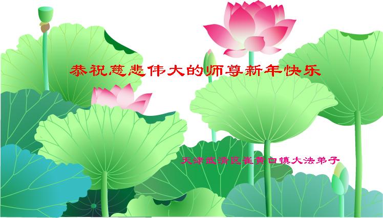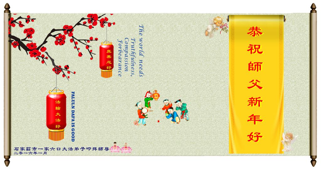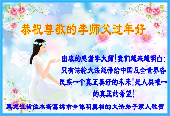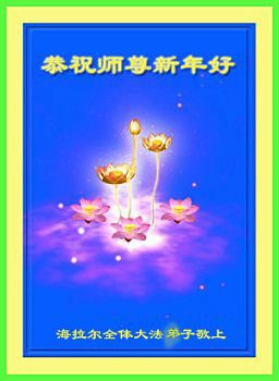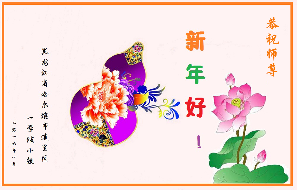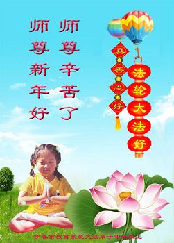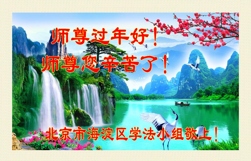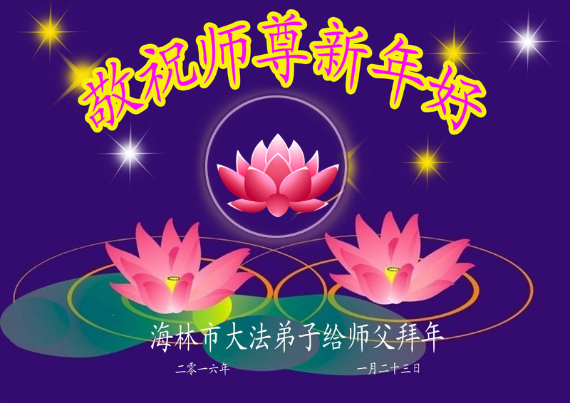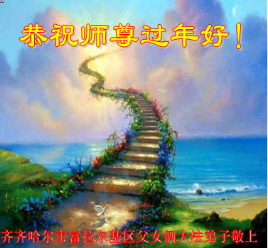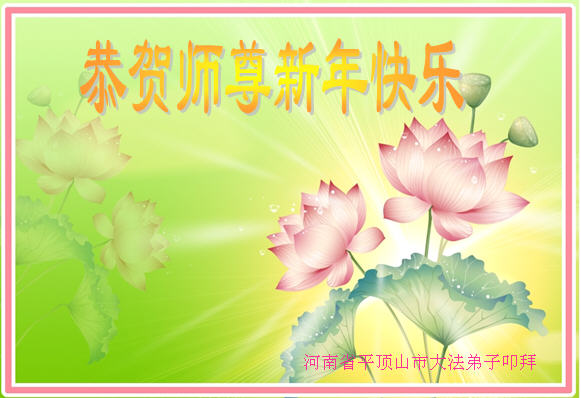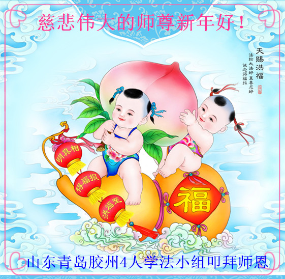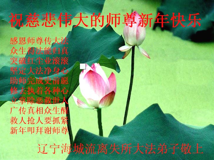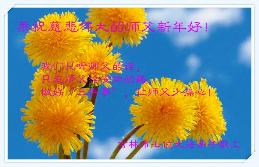 至尊无上的李大师新年好!穷尽人类的语言难以表达我们心中对李大师的无限感恩!法轮大法修炼者谨遵师命,按照真善忍的原则,遇事首先为他人着想的高贵品质,象一股清流涤荡着人类社会的一切邪恶!我们在此真心奉劝那些还被中共邪党蒙骗的世人,珍惜每一次法轮功弟子给你们的机会,明白法轮功真相,相信“法轮大法好”、“真、善、忍好”,给自己选择一个美好的未来!