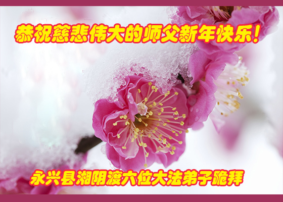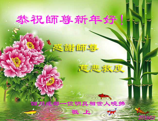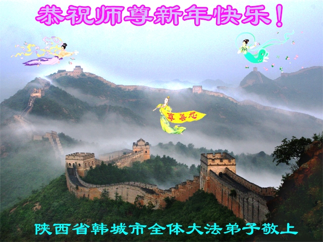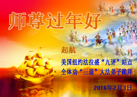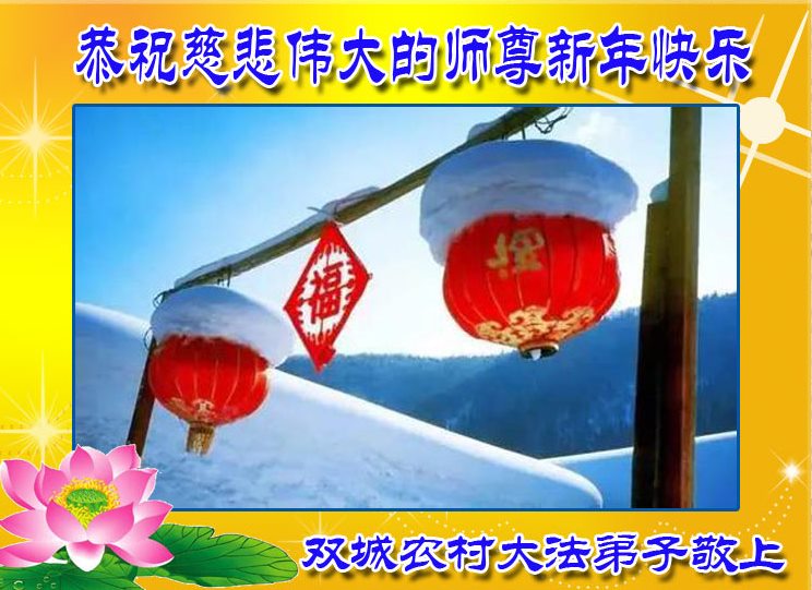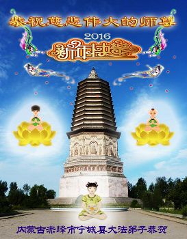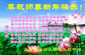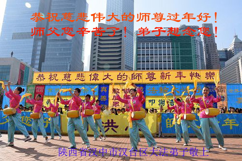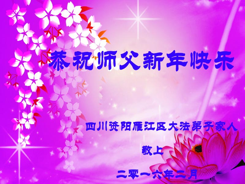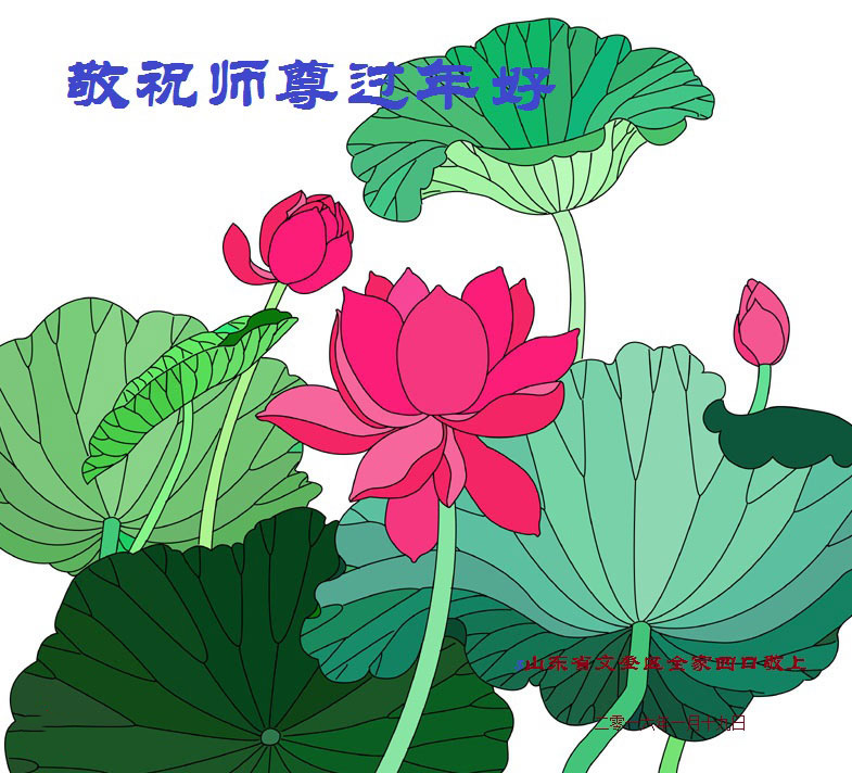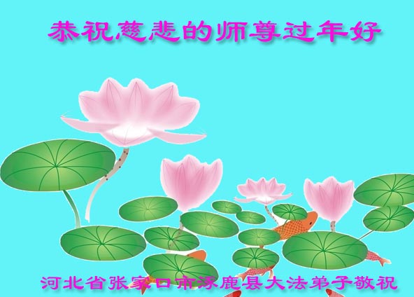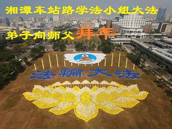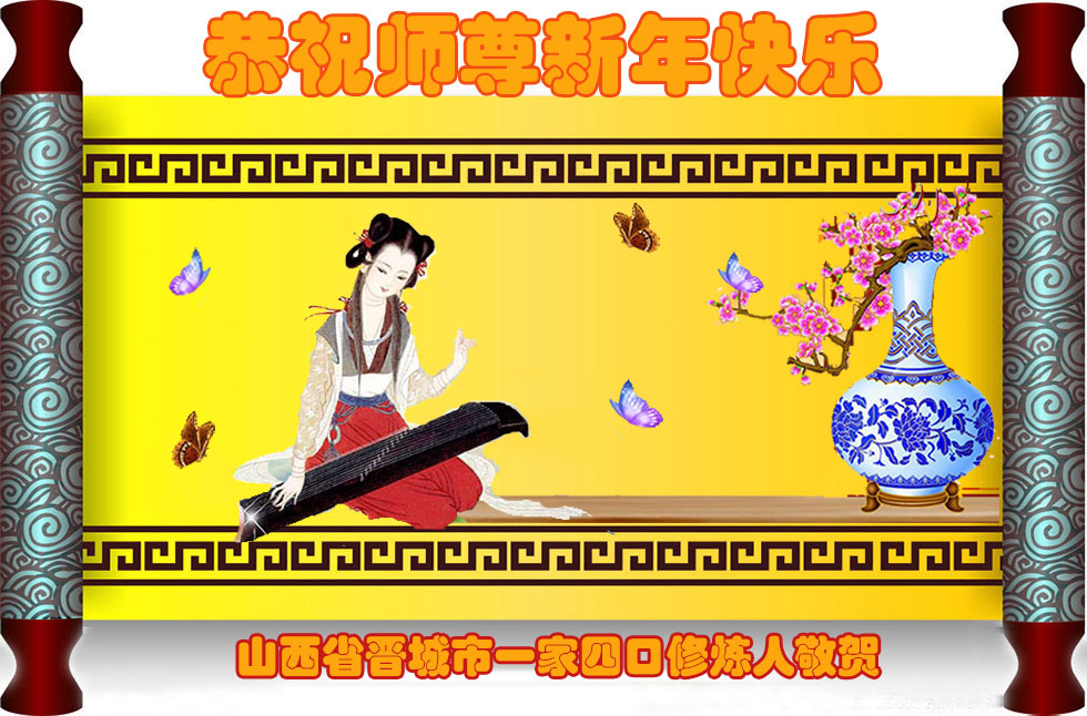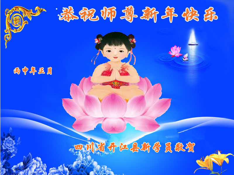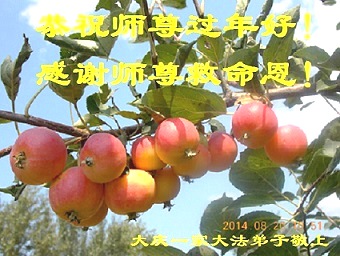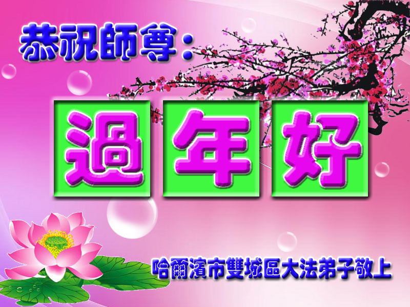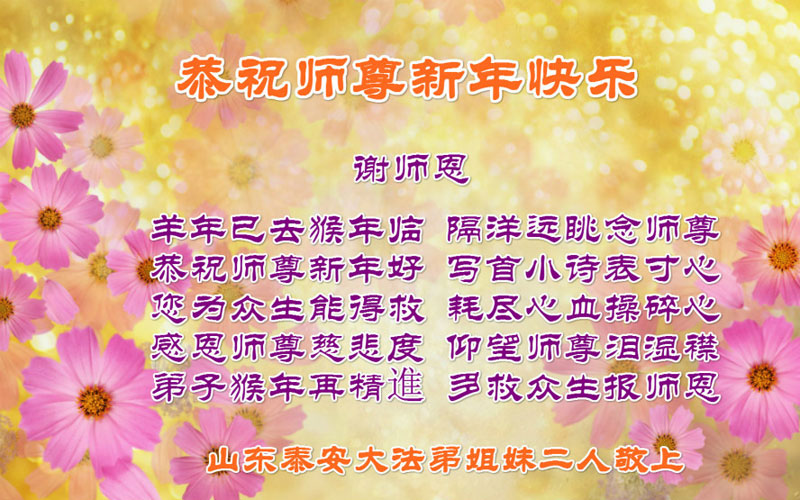 至尊无上的李大师新年好!穷尽人类的语言难以表达我们心中对李大师的无限感恩!法轮大法修炼者谨遵师命,按照真善忍的原则,遇事首先为他人着想的高贵品质,象一股清流涤荡着人类社会的一切邪恶!我们在此真心奉劝那些还被中共邪党蒙骗的世人,珍惜每一次法轮功弟子给你们的机会,明白法轮功真相,相信“法轮大法好”、“真、善、忍好”,给自己选择一个美好的未来!