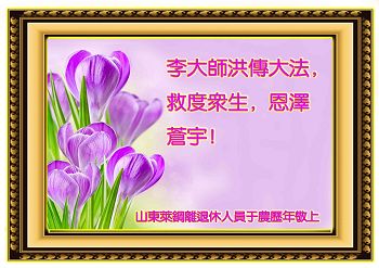 尊敬的李大师您好,新年到来,我们代表亲朋好友及明白大法真相的世人,向慈悲的李大师致以诚挚的问候!在此,我们呼吁所有还受中共邪党蒙骗的世人,赶快“三退保平安”,珍惜神佛的慈悲,为自己选择美好的未来!得救的生命跪谢李大师!