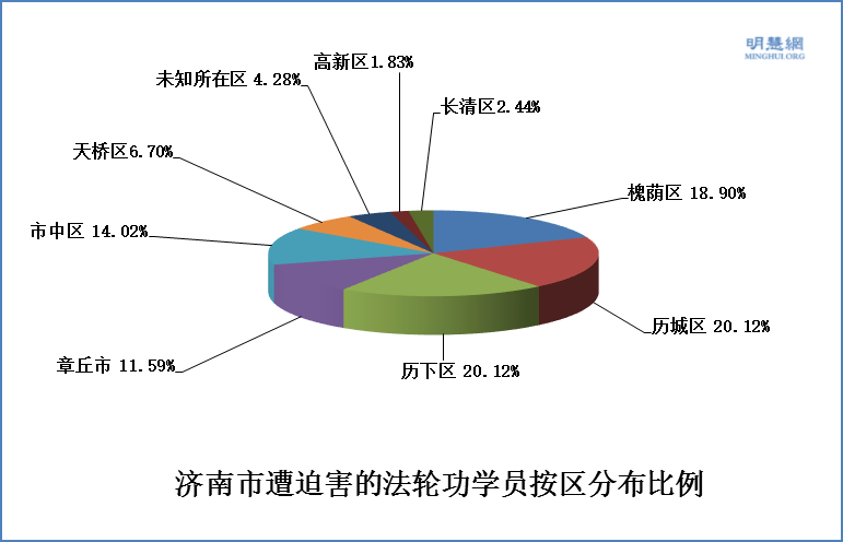 些因实名控告江泽民被迫害的法轮功学员,在济南市各区所占比例为: