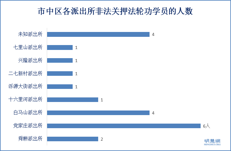 ![]() 图9:市中区各派出所非法关押法轮功学员的人数 |