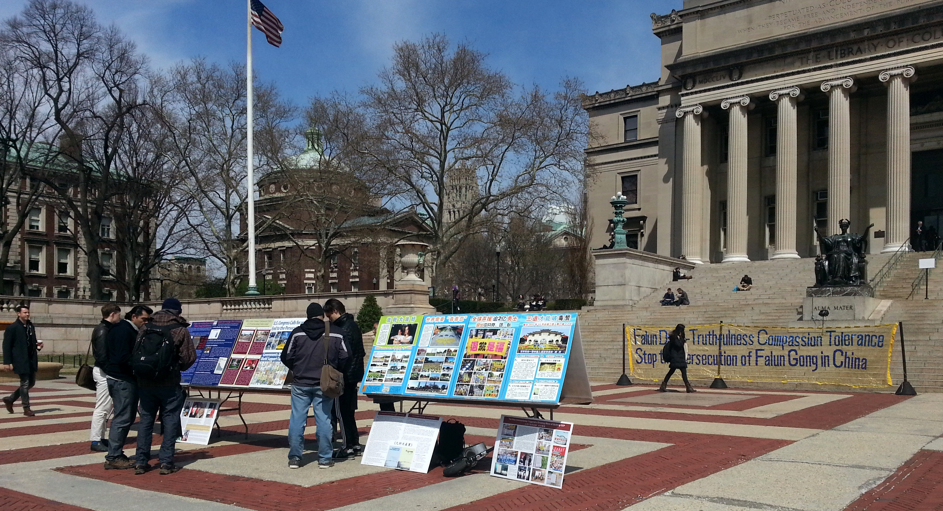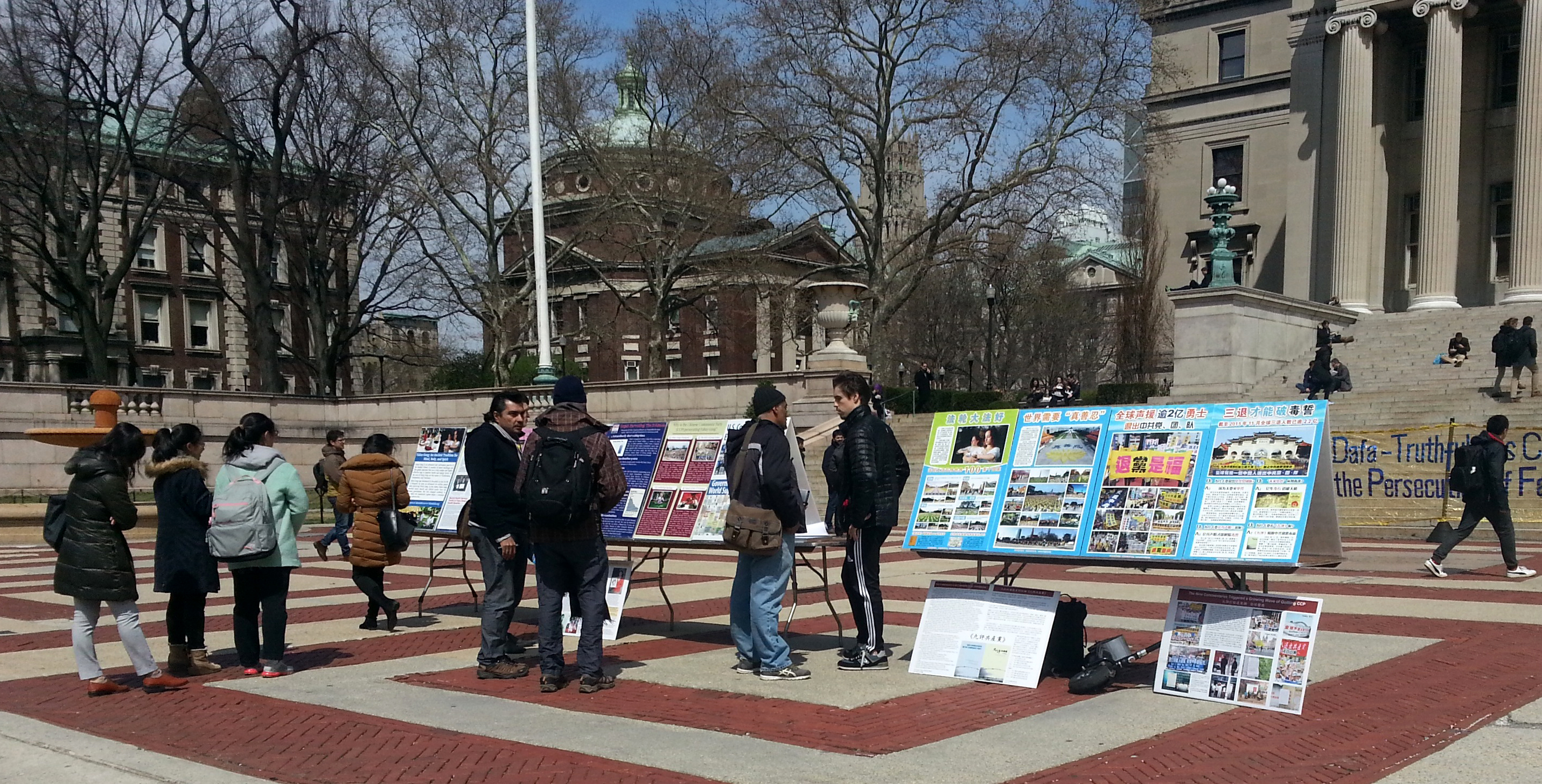 一个在哥大上研究生的中国学生来到展板前,他说:“随便看看,我对这些不感兴趣,不参与政治。”然后他又说:“我不关心这些,我们全家都不关心这个,我们全家都是学理的,对这些事情从不关心。”